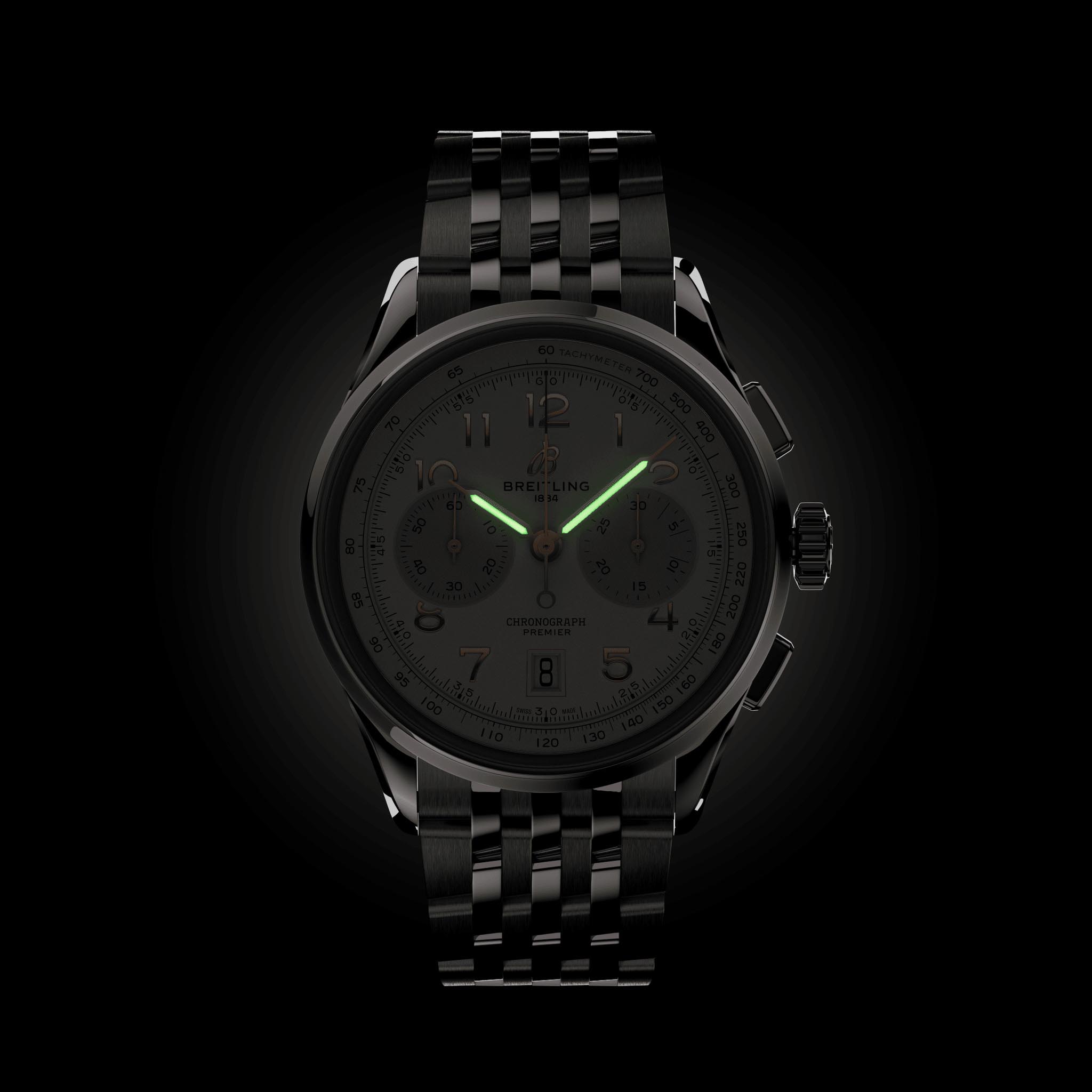 Мужские швейцарские часы-хронографХронографФункция позволяет измерять отрезки времени с особой точностью: часы, минуты, секунды. Верным признаком хронографа является наличие на циферблате 3 дополнительных окошек-счётчиков. с тахиметромТахиметрРазмеченная шкала, располагается на ободке или безеле часов. Тахиметр позволяет рассчитать скорость на определённом участке пути, расстояние измеряется в километрах или милях. Breitling Premier B01 Chronograph 42 AB0145211G1A1, механический механизм (автоматический калибр) с высокой точностью. Сапфировое стеклоСапфировое стеклоПрочный и надёжный материал из кристалла сапфира синтетического происхождения, характеризующийся особой твёрдостью и устойчивостью к царапинам и повреждениям. с антибликовым покрытием устойчивое к появлению царапин, обладающее высокой прозрачностью. Класс водозащиты: 100 метров, позволит плавать, нырять и заниматься другими водными видами спорта. Корпус часов изготовлен из стали. Стальной браслет с застёжкой-бабочкой с кнопкамиЗастёжка "бабочка"Такой вид застёжки дополняется предохранителями, помогающими избежать случайного раскрытия браслета. Обладают изящным исполнением. . Стрелки с люминесцентным покрытиемЛюминесцентное покрытиеПозволяет считывать показания времени в темноте. Производители наносят на стрелки, часовые индексы, безель или поверхность циферблата светонакопительный состав, дающий холодное свечение.. Окошко даты находится в положении 6 часов. СекундомерСекундомерСекундоме́р — прибор, способный измерять интервалы времени с точностью до долей секунды..