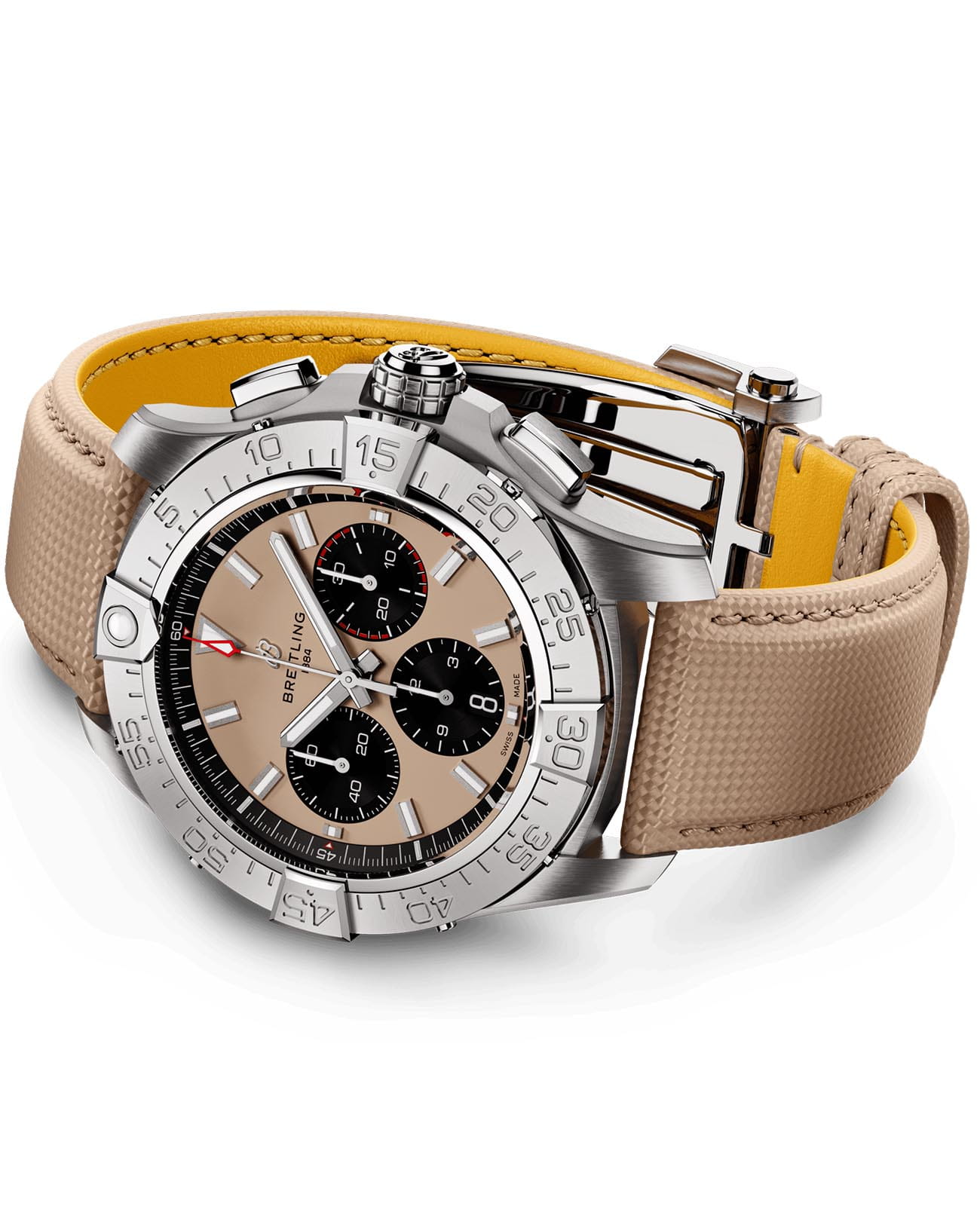 Мужские наручные часы c хронографомХронографФункция позволяет измерять отрезки времени с особой точностью: часы, минуты, секунды. Верным признаком хронографа является наличие на циферблате 3 дополнительных окошек-счётчиков. Breitling Avenger B01 Chronograph 44 AB0147101A1X1 с надёжным автоматическим механизмом. Корпус часов изготовлен из нержавеющей стали. Сапфировое стеклоСапфировое стеклоПрочный и надёжный материал из кристалла сапфира синтетического происхождения, характеризующийся особой твёрдостью и устойчивостью к царапинам и повреждениям. с антибликовым покрытием, устойчивое к мелким механическим повреждениям. Практичный кожаный ремешок на стандартной застёжке. Стрелки и метки с люминесцентным покрытиемЛюминесцентное покрытиеПозволяет считывать показания времени в темноте. Производители наносят на стрелки, часовые индексы, безель или поверхность циферблата светонакопительный состав, дающий холодное свечение.. Однонаправленный безельБезельВнешний ободок, закрепляющий стекло. В спортивных часах так называется поворотное кольцо с делениями на циферблате, выполняет роль таймера – замеряет отрезки времени на шкале. Неподвижный безель – элемент декора. Однонаправленно вращающийся безель на дайверских часах позволяет фиксировать моменты погружения и выныривания на поверхность..