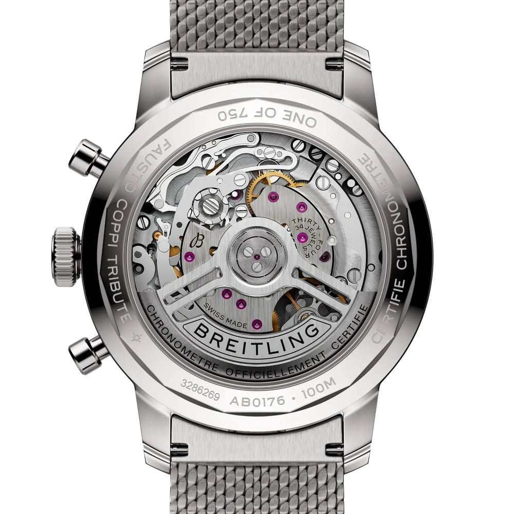 Breitling Top Time B01 Fausto Coppi AB01768A1A1A1 — лимитированные часы, вдохновлённые легендой велоспорта Фаусто Коппи и эстетикой ретро-хронографов 60-х годов. Корпус диаметром 41 мм выполнен из нержавеющей стали с комбинированной сатинированной и полированной отделкой. Прозрачная задняя крышка с гравировкой «Fausto Coppi Tribute» и «One of 750» подчёркивает уникальность выпуска. Циферблат защищён сапфировым стекломСапфировое стеклоПрочный и надёжный материал из кристалла сапфира синтетического происхождения, характеризующийся особой твёрдостью и устойчивостью к царапинам и повреждениям. с антибликовым покрытиемАнтибликовое покрытиеСлой оксида металла в 0,13-0,3 микрон, благодаря которому стекло часов не бликует и не отражает свет. Антибликовое покрытие уменьшает отражение света в 10 раз, обеспечивая отличную читаемость показателей циферблата.. Белый матовый циферблат украшен бирюзовыми субциферблатами и надписью «Il Campionissimo» по внешнему кругу. Подпись Fausto Coppi расположена на отметке 6 часов. Внутри установлен швейцарский автоматический калибр COSC-сертифицированныйСертификат COSCОфициальный сертификат, подтверждающий то, что часы ходят с особо высокой точностью. Для получения документа часы подвергаются тестовым испытаниям, разработанным швейцарским институтом тестирования хронометров COSC. Допустимая норма для механических часов -4/+6 секунд в день, для кварцевых моделей +/- 0,07 секунд в день. хронографХронографФункция позволяет измерять отрезки времени с особой точностью: часы, минуты, секунды. Верным признаком хронографа является наличие на циферблате 3 дополнительных окошек-счётчиков. Breitling B01, обеспечивающий точность, стабильность и запас хода до 70 часов. Модель укомплектована браслетом миланского плетения на застёжке «бабочка» с кнопкамиЗастёжка "бабочка"Такой вид застёжки дополняется предохранителями, помогающими избежать случайного раскрытия браслета. Обладают изящным исполнением. . Водонепроницаемость 100 метров делает часы надёжными не только в городе, но и в активной среде. Эта лимитированная модель — признание в любви к велоспорту и винтажной эстетике.