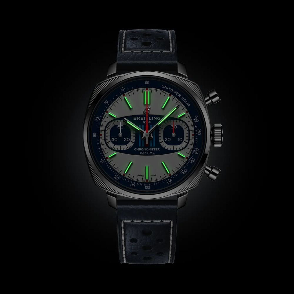 Breitling Top Time B31 AB01772A1G1X1 — стильная новинка 2025 года с характерной винтажной эстетикой и современным механизмом собственного производства. Корпус диаметром 38 мм выполнен из нержавеющей стали с полированной отделкой. Циферблат защищён выпуклым сапфировым стекломСапфировое стеклоПрочный и надёжный материал из кристалла сапфира синтетического происхождения, характеризующийся особой твёрдостью и устойчивостью к царапинам и повреждениям. с двухсторонним антибликовым покрытиемАнтибликовое покрытиеСлой оксида металла в 0,13-0,3 микрон, благодаря которому стекло часов не бликует и не отражает свет. Антибликовое покрытие уменьшает отражение света в 10 раз, обеспечивая отличную читаемость показателей циферблата.. Циферблат с контрастным внутренним кольцом и яркой оранжевой секундной стрелкой оформлен в узнаваемом стиле коллекции Top Time. Стрелки и часовые метки имеют люминесцентное покрытиеЛюминесцентное покрытиеПозволяет считывать показания времени в темноте. Производители наносят на стрелки, часовые индексы, безель или поверхность циферблата светонакопительный состав, дающий холодное свечение., обеспечивающее отличную читаемость. Внутри установлен автоматический калибр Breitling B31, отображающий часы, минуты, малую секунду и дату. Механизм обеспечивает запас хода до 78 часов и работает с частотой 28 800 полуколебаний в час. Часы укомплектованы перфорированным кожаным ремешком и классической застёжкой-пряжкой. Водонепроницаемость 100 метров делает модель универсальной для повседневного использования. Top Time B31 AB01772A1G1X1 — гармония винтажного дизайна и инновационного часового мастерства.