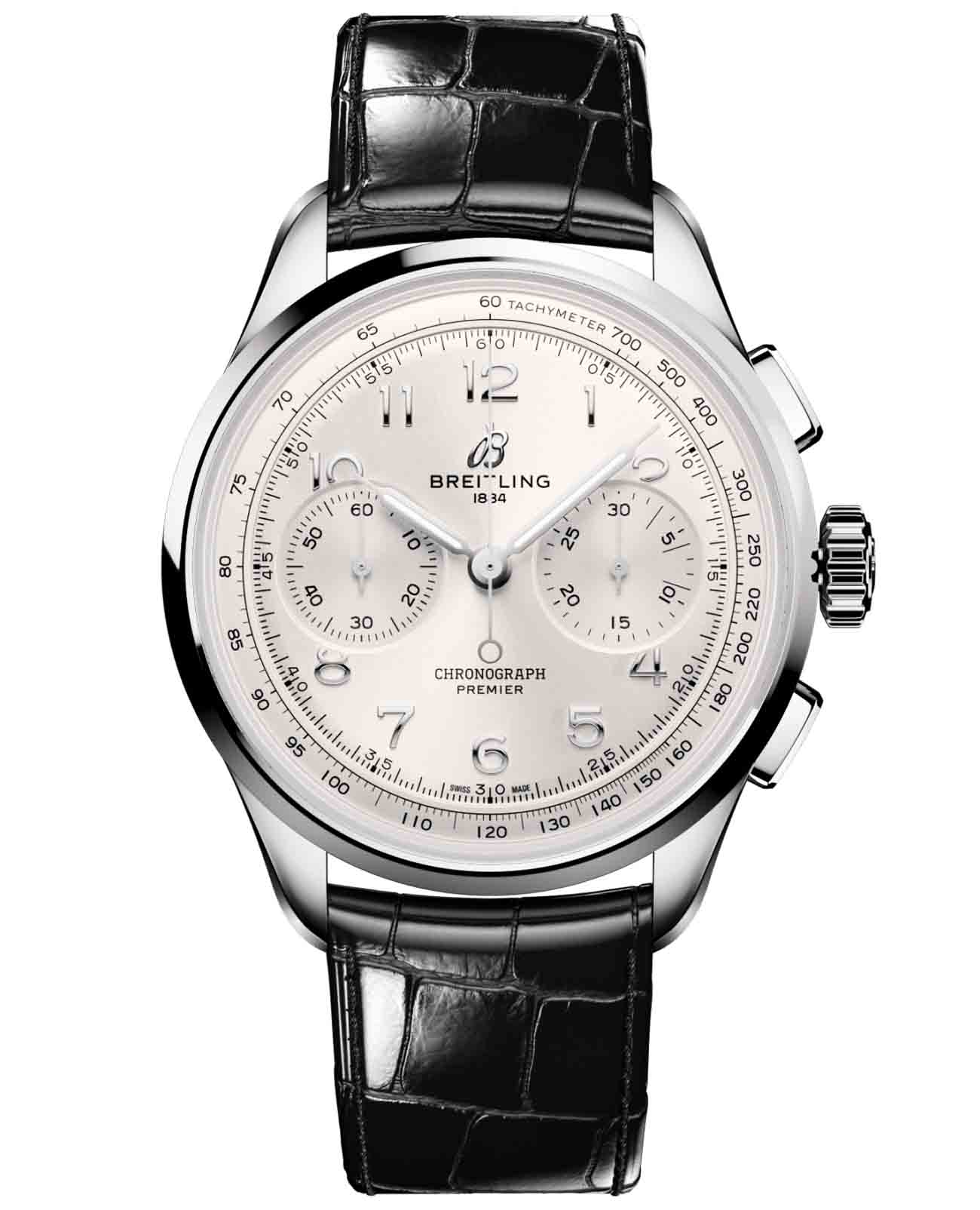 Мужские швейцарские часы-хронографХронографФункция позволяет измерять отрезки времени с особой точностью: часы, минуты, секунды. Верным признаком хронографа является наличие на циферблате 3 дополнительных окошек-счётчиков. Breitling Premier B09 Chronograph 40 AB0930371G1P1, механический механизм (автоматический калибр) с высокой точностью. Отдавая дань уважения трем поколениям изобретателей — Леону, Гастону и Вилли Брайтлингу, коллекция Premier воплощает наследие Брайтлинга как изобретателя современного хронографа. Как выразился Вилли Брайтлинг, Premier - это безошибочный признак безупречного вкуса. Сапфировое стеклоСапфировое стеклоПрочный и надёжный материал из кристалла сапфира синтетического происхождения, характеризующийся особой твёрдостью и устойчивостью к царапинам и повреждениям. устойчивое к появлению царапин, обладающее высокой прозрачностью. Класс водозащиты: 100 метров, позволит плавать, нырять и заниматься другими водными видами спорта. Корпус часов изготовлен из стали. Кожаный крокодиловый ремешок с раскладной застёжкойРаскладная застёжкаТакой тип застёжки используется только на браслетах из металла. Она никогда не раскрывается полностью, происходит разделение на 2 и более частей. Раскладывающая застёжка снизит вероятность потери часов к минимуму.. Модель оснащена целым рядом усовершенствований: хронографомХронографФункция позволяет измерять отрезки времени с особой точностью: часы, минуты, секунды. Верным признаком хронографа является наличие на циферблате 3 дополнительных окошек-счётчиков., секундомеромСекундомерСекундоме́р — прибор, способный измерять интервалы времени с точностью до долей секунды. Biography, полным календарем Datora и турбийоном. Возрожденный к традициям дизайн хронографа Premier отличается множеством элегантных деталей, таких как углубления по бокам корпуса, прямоугольные кнопки, нанесенные арабские цифры и стрелки в винтажном стиле. Он также оснащен открытой сапфировой задней крышкой, на которой виден калибр B09 с ручным заводом COSCСертификат COSCОфициальный сертификат, подтверждающий то, что часы ходят с особо высокой точностью. Для получения документа часы подвергаются тестовым испытаниям, разработанным швейцарским институтом тестирования хронометров COSC. Допустимая норма для механических часов -4/+6 секунд в день, для кварцевых моделей +/- 0,07 секунд в день., сертифицированный Breitling Manufacture.