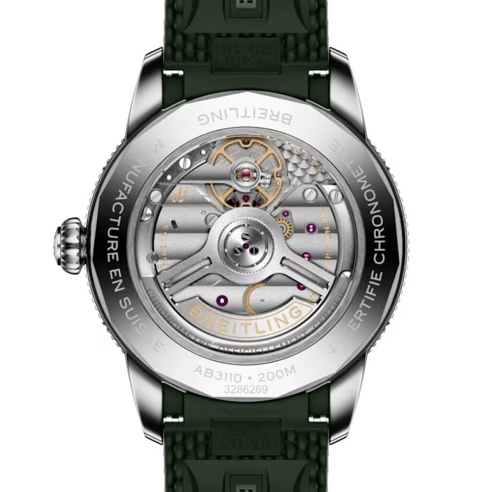 Женские механические часы Breitling Superocean Heritage B31 Automatic 40 AB3110361L1S1 — это стильное сочетание элегантности и современного дизайна. Корпус из нержавеющей стали диаметром 40 мм, идеально сбалансирован и элегантен. Сапфировое стеклоСапфировое стеклоПрочный и надёжный материал из кристалла сапфира синтетического происхождения, характеризующийся особой твёрдостью и устойчивостью к царапинам и повреждениям. с антибликовым покрытием защищает циферблат от царапин и обеспечивает отличную читаемость при любом освещении. Каучуковый ремешок на раскладной застёжкеРаскладная застёжкаТакой тип застёжки используется только на браслетах из металла. Она никогда не раскрывается полностью, происходит разделение на 2 и более частей. Раскладывающая застёжка снизит вероятность потери часов к минимуму. идеально дополняют дизайн часов, обеспечивая комфортное ношение. Стрелки и метки на циферблате имеют люминесцентное покрытиеЛюминесцентное покрытиеПозволяет считывать показания времени в темноте. Производители наносят на стрелки, часовые индексы, безель или поверхность циферблата светонакопительный состав, дающий холодное свечение. Super-LumiNova® позволяющее легко определять время даже в темноте. Вращающийся безельБезельВнешний ободок, закрепляющий стекло. В спортивных часах так называется поворотное кольцо с делениями на циферблате, выполняет роль таймера – замеряет отрезки времени на шкале. Неподвижный безель – элемент декора. Однонаправленно вращающийся безель на дайверских часах позволяет фиксировать моменты погружения и выныривания на поверхность. с керамической вставкой обеспечивает исключительную устойчивость к царапинам. Часы обладают впечатляющей водонепроницаемостью до 20 бар (200 метров), что делает их идеальными для плавания, ныряния и погружений с аквалангом. Окошко даты находится в положении 6 часов. Прочная конструкция часов и высокопроизводительный механизм делают их идеальным спутником для любителей активного отдыха. В коллекции представлен автоматический механизм B31, первый эксклюзивный калибр Breitling с тремя стрелками.