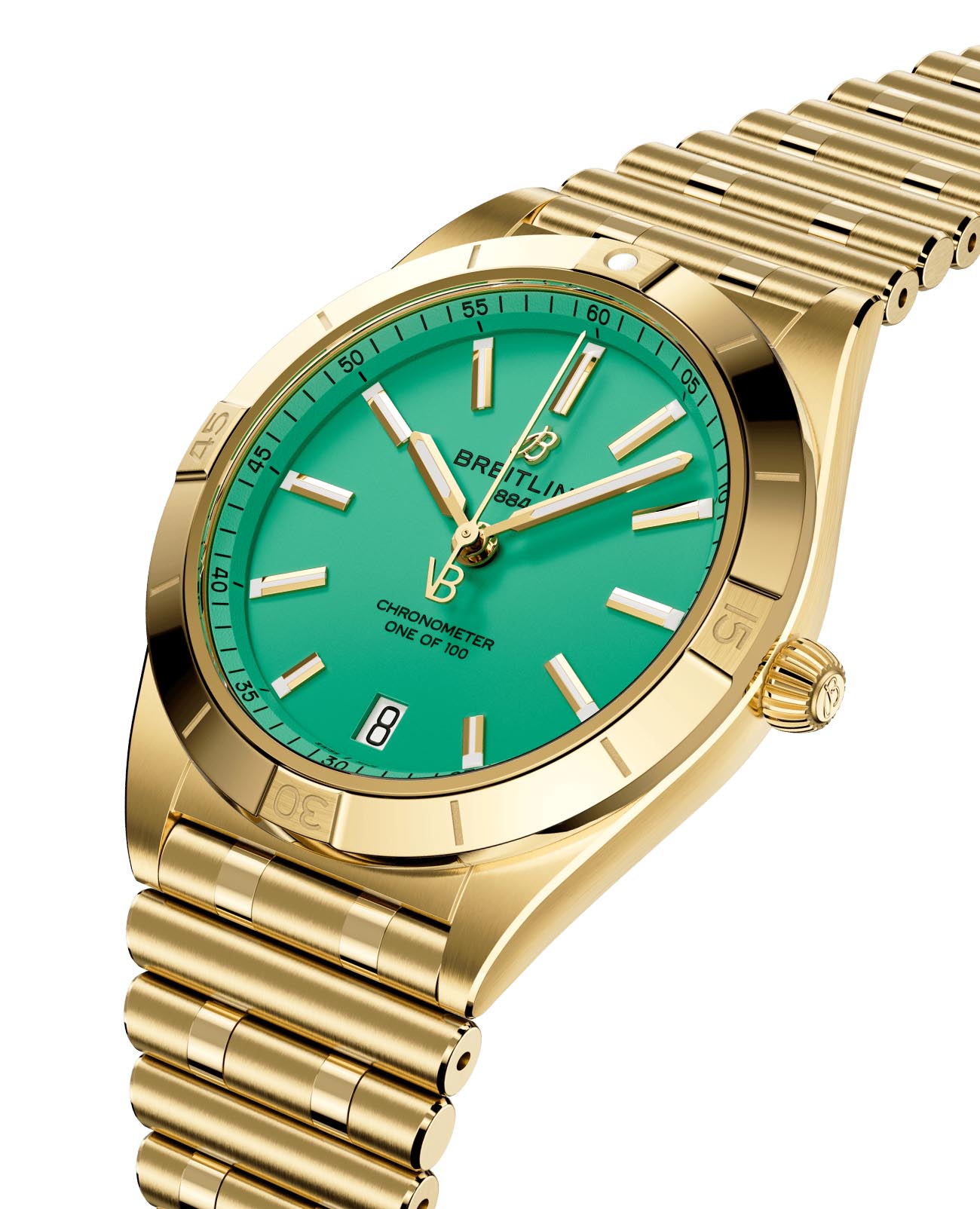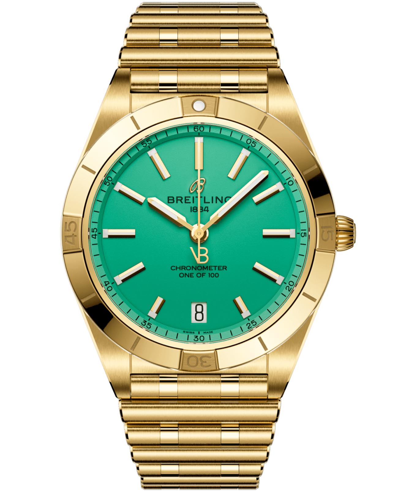 Женские швейцарские часы Breitling Chronomat Automatic 36 Victoria Beckham K103801A1L1K1 с надёжным автоматическим механизмом, выпущенные лимитированной серией всего из 1500 экземпляров в сотрудничестве с модным домом Victoria Beckham. Сапфировое стеклоСапфировое стеклоПрочный и надёжный материал из кристалла сапфира синтетического происхождения, характеризующийся особой твёрдостью и устойчивостью к царапинам и повреждениям. устойчивое к мелким механическим повреждениям. Корпус и браслет часов изготовлены из желтого 18-каратного золота18-каратное золотоОбозначение по каратной системе пробирования, оно показывает, сколько драгоценного металла содержится в изделии. 18 карат - в составе 75% чистого золота, соответствует 750 пробе.