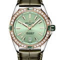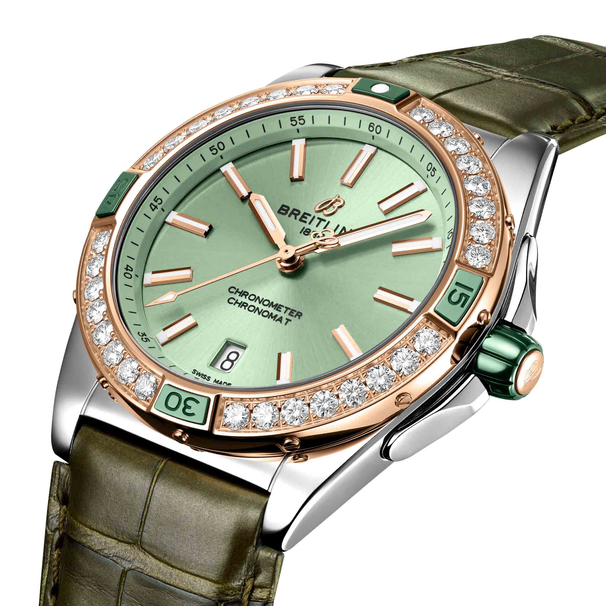 Женские швейцарские часы Breitling Super Chronomat Automatic 38 U17356531L1P1, механический механизм (автоматический калибр) с высокой точностью. Сапфировое стеклоСапфировое стеклоПрочный и надёжный материал из кристалла сапфира синтетического происхождения, характеризующийся особой твёрдостью и устойчивостью к царапинам и повреждениям. устойчивое к появлению царапин, обладающее высокой прозрачностью. Класс водозащиты: 100 метров, позволит плавать, нырять и заниматься другими водными видами спорта. Корпус часов изготовлен из стали. Кожаный крокодиловый ремешок с раскладной застёжкойРаскладная застёжкаТакой тип застёжки используется только на браслетах из металла. Она никогда не раскрывается полностью, происходит разделение на 2 и более частей. Раскладывающая застёжка снизит вероятность потери часов к минимуму.. Отличить Super от остальных моделей семейства Chronomat можно по керамическим язычкам и заводной головке. Помимо улучшенного внешнего вида, Automatic 38 также имеет сияющую сторону. БезельБезельВнешний ободок, закрепляющий стекло. В спортивных часах так называется поворотное кольцо с делениями на циферблате, выполняет роль таймера – замеряет отрезки времени на шкале. Неподвижный безель – элемент декора. Однонаправленно вращающийся безель на дайверских часах позволяет фиксировать моменты погружения и выныривания на поверхность. из красного золота 18 карат украшен крупными бриллиантами, выращенными в лабораторных условиях. Цвета циферблата добавляют как раз нужное количество привлекательности для глаз. Окошко даты находится в положении 6 часов. Стрелки и метки с люминесцентным покрытиемЛюминесцентное покрытиеПозволяет считывать показания времени в темноте. Производители наносят на стрелки, часовые индексы, безель или поверхность циферблата светонакопительный состав, дающий холодное свечение..