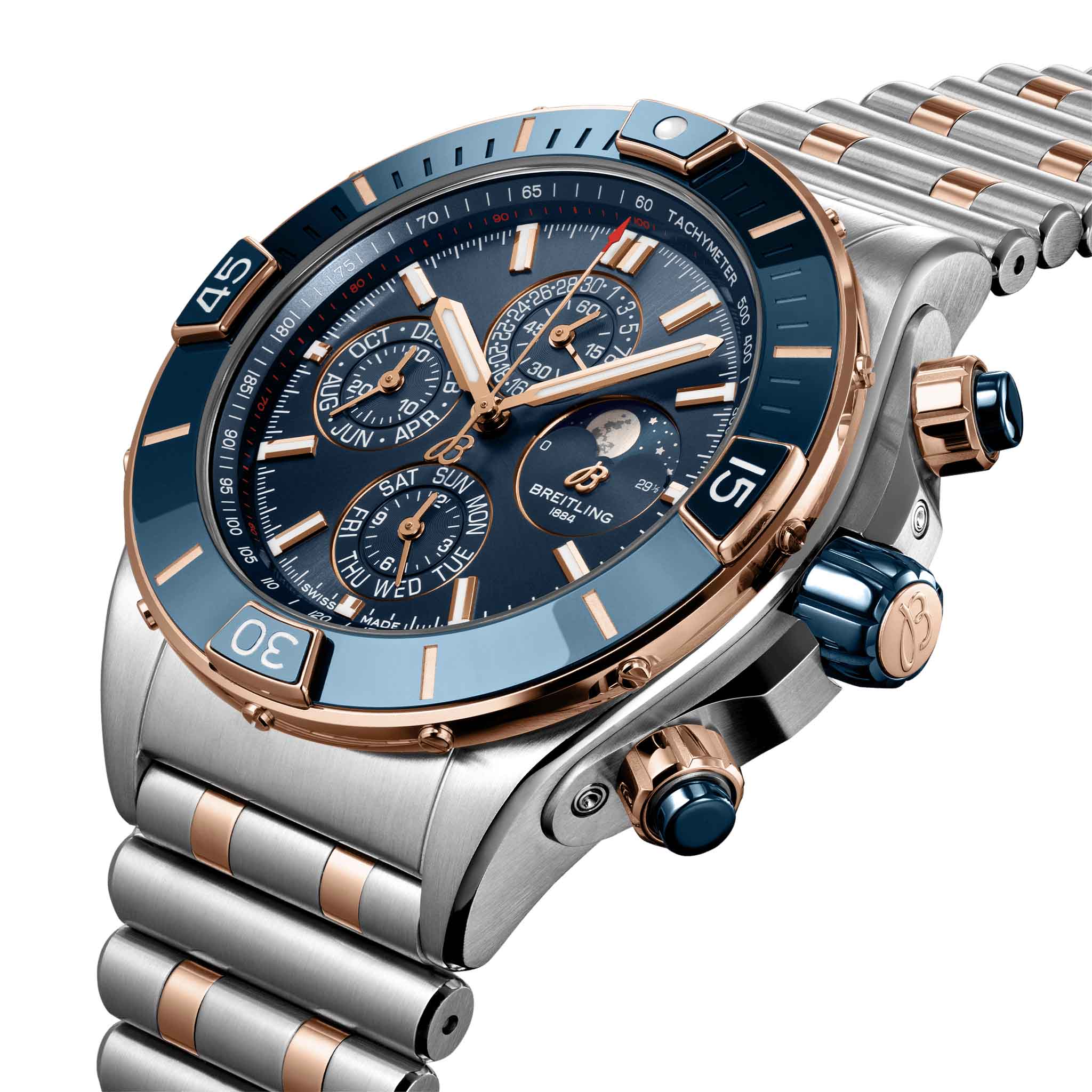 «Реактивные» часы Breitling с четырехлетним календарем на все случаи жизни. Часы Super Chronomat созданы по мотивам оригинальной модели Chronomat 80-х годов, которая была разработана компанией Breitling для асов пилотажной эскадрильи. Обладающие наиболее смелым дизайном из всех моделей коллекции Chronomat, часы Super Chronomat отличаются кармической инкрустацией на безеле, кнопках хронографа и заводной головке.