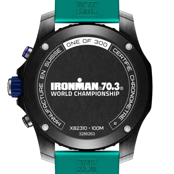 Мужские кварцевые часы Breitling Professional Pro 44 IRONMAN® 70.3 World Championship 2025 X823101K1C1S1 — это инновационный аксессуар, разработанный для спортсменов и активных людей. Это уникальное коллекционное издание, выпущенное ограниченным тиражом в 300 экземпляров, отличается характерным дизайном и цветовой гаммой чемпионата мира IRONMAN® 70.3. Модель выполнена из эксклюзивного материала Breitlight®, который в 3,3 раза легче титана и в 5,8 раза легче нержавеющей стали. Этот немагнитный, термостойкий и гипоаллергенный материал обладает высокой устойчивостью к царапинам, истиранию и коррозии, а также имеет слегка текстурированную поверхность, подчеркивающую оригинальность дизайна. Циферблат защищен сапфировым стекломСапфировое стеклоПрочный и надёжный материал из кристалла сапфира синтетического происхождения, характеризующийся особой твёрдостью и устойчивостью к царапинам и повреждениям. с двусторонним антибликовым покрытиемАнтибликовое покрытиеСлой оксида металла в 0,13-0,3 микрон, благодаря которому стекло часов не бликует и не отражает свет. Антибликовое покрытие уменьшает отражение света в 10 раз, обеспечивая отличную читаемость показателей циферблата., устойчивым к повреждениям, а также дополнен вращающимся безелемБезельВнешний ободок, закрепляющий стекло. В спортивных часах так называется поворотное кольцо с делениями на циферблате, выполняет роль таймера – замеряет отрезки времени на шкале. Неподвижный безель – элемент декора. Однонаправленно вращающийся безель на дайверских часах позволяет фиксировать моменты погружения и выныривания на поверхность.. Стрелки имеют люминесцентное покрытиеЛюминесцентное покрытиеПозволяет считывать показания времени в темноте. Производители наносят на стрелки, часовые индексы, безель или поверхность циферблата светонакопительный состав, дающий холодное свечение.. Часы оснащены термоустойчивым механизмом SuperQuartz™ (калибр Breitling 82), сертификатом COSCСертификат COSCОфициальный сертификат, подтверждающий то, что часы ходят с особо высокой точностью. Для получения документа часы подвергаются тестовым испытаниям, разработанным швейцарским институтом тестирования хронометров COSC. Допустимая норма для механических часов -4/+6 секунд в день, для кварцевых моделей +/- 0,07 секунд в день., обеспечивающим исключительную точность. Функции включают отображение времени, секундомер с точностью 1/10 секунды и временем измерения до 30 минут, а также апертура даты на циферблате, хронографХронографФункция позволяет измерять отрезки времени с особой точностью: часы, минуты, секунды. Верным признаком хронографа является наличие на циферблате 3 дополнительных окошек-счётчиков.. Водонепроницаемость позволяет использовать модель при плавании и других водных активностях без глубокого погружения. Ремешок из каучука шириной 22 мм оснащён из материала Breitlight®, обеспечивающей комфорт и надёжную фиксацию на запястье. Вес изделия составляет 68,668 г, а диаметр корпуса — 44 мм. Эти часы станут универсальным аксессуаром для тех, кто ценит сочетание стиля, функциональности и надёжности — идеальный выбор для повседневной носки и активного образа жизни.