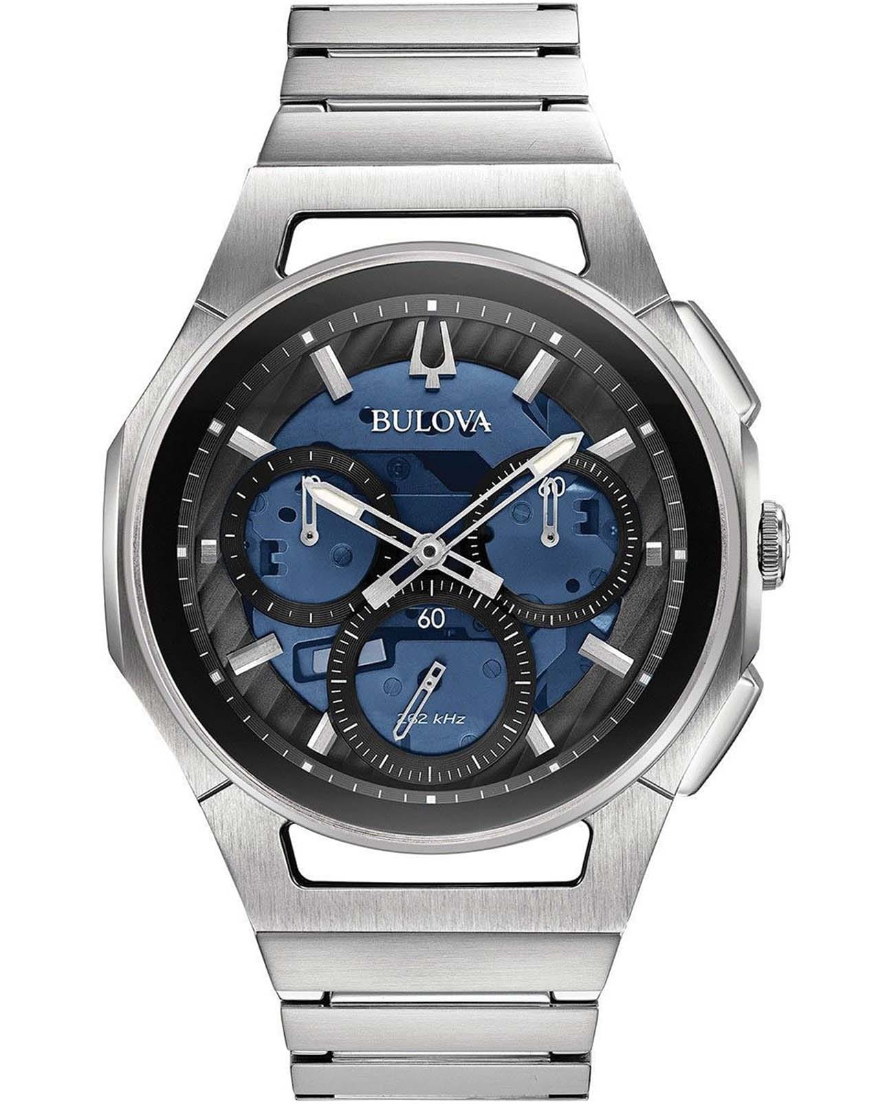 Мужские кварцевые часы-хронографХронографФункция позволяет измерять отрезки времени с особой точностью: часы, минуты, секунды. Верным признаком хронографа является наличие на циферблате 3 дополнительных окошек-счётчиков. Bulova CURV 96A205 – отражающий идеальное сочетание современного дизайна, надёжности и функциональности. Элегантный облик станет превосходным завершением образа, наделив его индивидуальным характером. Корпус из нержавеющей стали серебристого цвета, диаметром 44 мм идеально сбалансирован и элегантен. Защиту циферблата обеспечивает прочное сапфировое стеклоСапфировое стеклоПрочный и надёжный материал из кристалла сапфира синтетического происхождения, характеризующийся особой твёрдостью и устойчивостью к царапинам и повреждениям. гарантирующее четкость показаний. Центральные часовая и минутная стрелки. Стальной браслет на застёжке-бабочке с кнопкамиЗастёжка "бабочка"Такой вид застёжки дополняется предохранителями, помогающими избежать случайного раскрытия браслета. Обладают изящным исполнением. обеспечивает комфортное ношение. Водозащита 30 метров позволит защитить корпус от случайных брызг или капель дождя. Стрелки с люминесцентным покрытиемЛюминесцентное покрытиеПозволяет считывать показания времени в темноте. Производители наносят на стрелки, часовые индексы, безель или поверхность циферблата светонакопительный состав, дающий холодное свечение. позволяющие легко определять время даже в темноте. Эта модель – отличный выбор для тех, кто ищет сочетание стиля, качества и функциональности. Часы станут не только полезным аксессуаром, но и выразительным элементом вашего имиджа.
