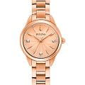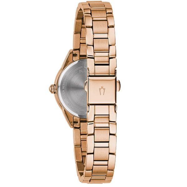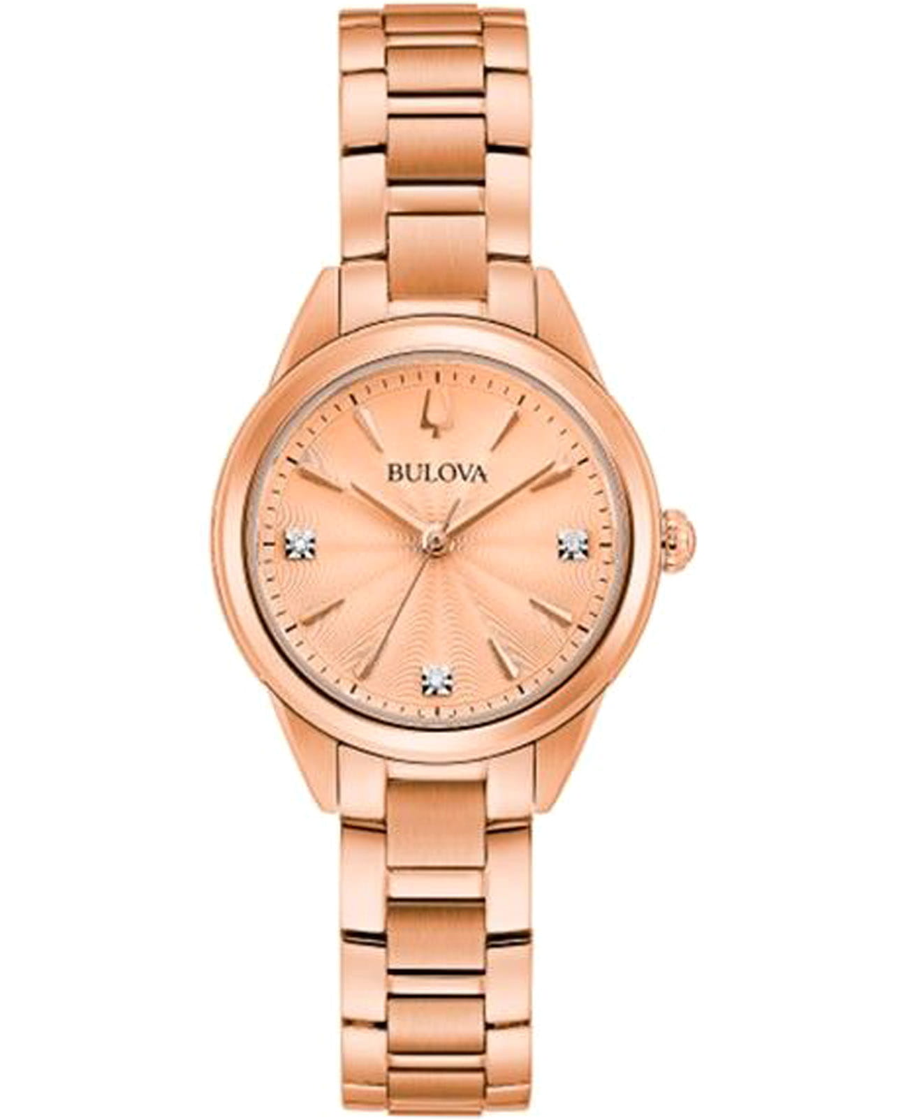 Женские кварцевые часы Bulova Sutton 97P151 – отражающий идеальное сочетание современного дизайна, надёжности и функциональности. Элегантный облик станет превосходным завершением образа, наделив его индивидуальным характером. Корпус из нержавеющей стали с PVD-покрытиемPVDУльтратонкое покрытие наносится в технике вакуумного напыления, сочетает в себе нитрид титана особой прочности со слоем золота или оксида хрома. Несёт в себе декоративную или защитную функцию. цвета розового золота, диаметром 28 мм идеально сбалансирован и элегантен. Минеральное стеклоМинеральное стеклоМинеральное стекло представляет собой искусственно выращенный минерал кварца. Такое стекло отличается особой устойчивостью к повреждениям и царапинам. Уступает по некоторым качествам сапфировому стеклу. защищает циферблат от царапин и устойчивое к мелким механическим повреждениям. Золотистый циферблат украшен бриллиантами. Стальной браслет с PVD-покрытиемPVDУльтратонкое покрытие наносится в технике вакуумного напыления, сочетает в себе нитрид титана особой прочности со слоем золота или оксида хрома. Несёт в себе декоративную или защитную функцию. на раскладной застёжкеРаскладная застёжкаТакой тип застёжки используется только на браслетах из металла. Она никогда не раскрывается полностью, происходит разделение на 2 и более частей. Раскладывающая застёжка снизит вероятность потери часов к минимуму. обеспечивает комфортное ношение. Водозащита 30 метров позволит защитить корпус от случайных брызг или капель дождя. Эта модель – отличный выбор для тех, кто ищет сочетание стиля, качества и функциональности. Часы станут не только полезным аксессуаром, но и выразительным элементом вашего имиджа.