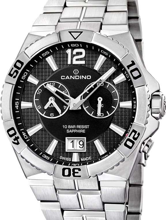 Мужские наручные часы Candino C4450/B из коллекции Sportive сочетают в себе спортивный дизайн и надежность швейцарского качества. Модель обладает круглым корпусом, изготовленным из нержавеющей стали, что обеспечивает высокую устойчивость к внешним воздействиям. Браслет из того же материала на раскладной застёжкеРаскладная застёжкаТакой тип застёжки используется только на браслетах из металла. Она никогда не раскрывается полностью, происходит разделение на 2 и более частей. Раскладывающая застёжка снизит вероятность потери часов к минимуму.. Черный циферблат дополнен окном даты и оснащен люминесцентными стрелками и меткамиЛюминесцентное покрытиеПозволяет считывать показания времени в темноте. Производители наносят на стрелки, часовые индексы, безель или поверхность циферблата светонакопительный состав, дающий холодное свечение., обеспечивающими отличную видимость в темноте . Для защиты используется сапфировое стеклоСапфировое стеклоПрочный и надёжный материал из кристалла сапфира синтетического происхождения, характеризующийся особой твёрдостью и устойчивостью к царапинам и повреждениям., которое обеспечивает прочную защиту от царапин и антибликовый эффект. Часы работают на кварцевом механизме, что гарантирует точное время без необходимости подзаводки. Водонепроницаемость модели достигает 100 метров (10 атмосфер), что позволяет использовать их во время плавания и других водных видов спорта .