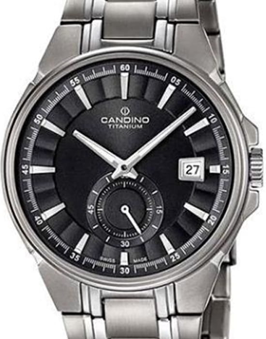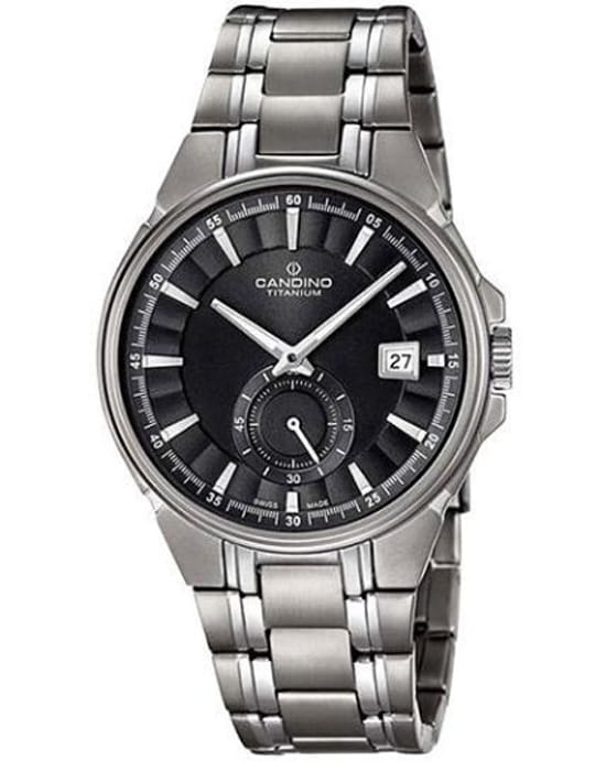 Швейцарские мужские наручные часы Candino Titanium C4604/C, кварцевый механизм с высокой точностью. Сапфировое стеклоСапфировое стеклоПрочный и надёжный материал из кристалла сапфира синтетического происхождения, характеризующийся особой твёрдостью и устойчивостью к царапинам и повреждениям. устойчивое к появлению царапин, обладающее высокой прозрачностью. Корпус часов изготовлен из титана. Секундная стрелка вынесена на отдельный циферблат. Стрелки и метки с люминесцентным покрытиемЛюминесцентное покрытиеПозволяет считывать показания времени в темноте. Производители наносят на стрелки, часовые индексы, безель или поверхность циферблата светонакопительный состав, дающий холодное свечение.. Окошко даты находится в положении 3 часов. Класс водозащиты: 50 метров, позволит защитить корпус от случайных брызг или капель дождя. Титановый браслет на раскладной застёжкеРаскладная застёжкаТакой тип застёжки используется только на браслетах из металла. Она никогда не раскрывается полностью, происходит разделение на 2 и более частей. Раскладывающая застёжка снизит вероятность потери часов к минимуму..