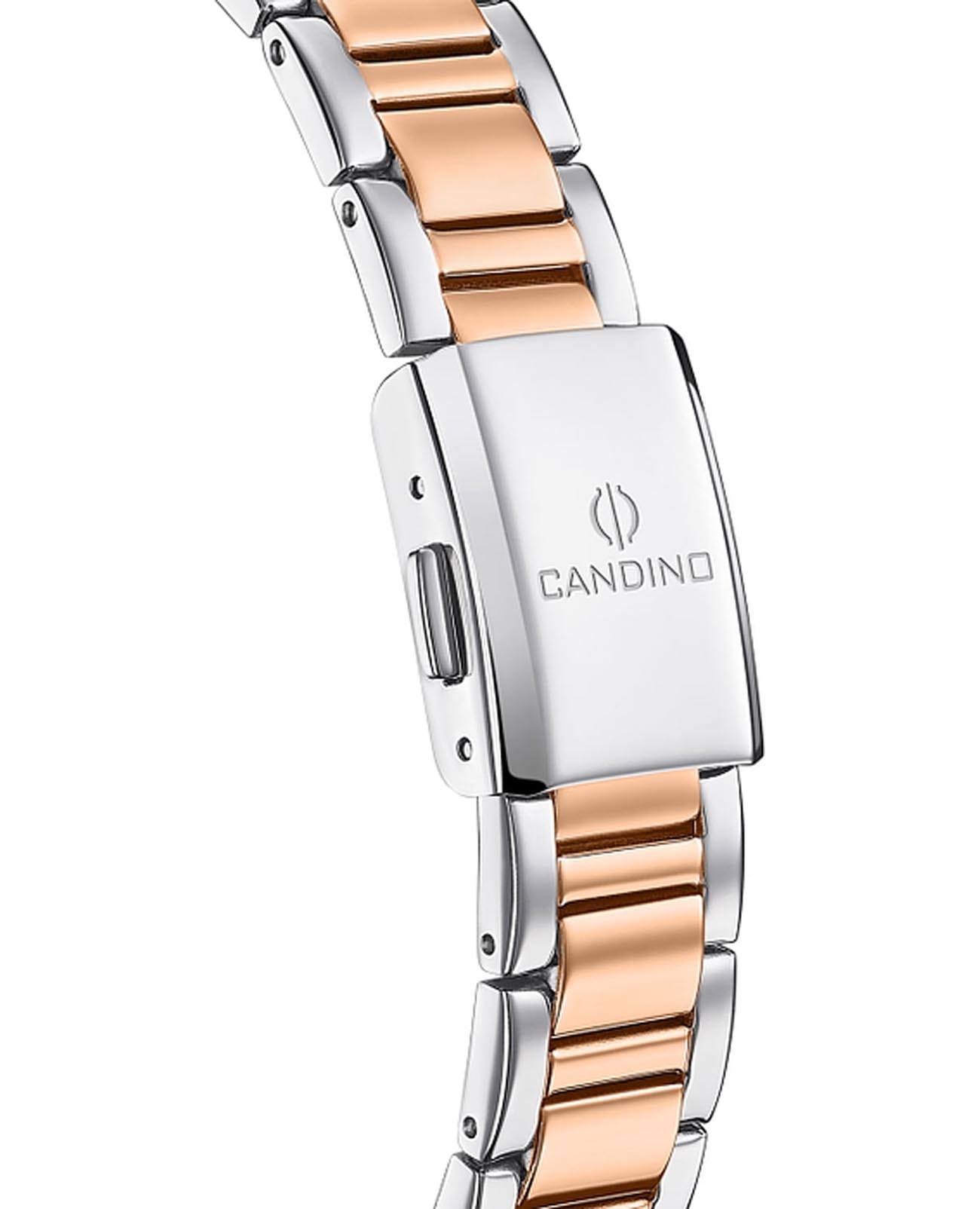 Женские швейцарские часы Candino Elegance C4739/4 с надёжным кварцевым механизмом. Корпус часов изготовлен из нержавеющей стали. Сапфировое стеклоСапфировое стеклоПрочный и надёжный материал из кристалла сапфира синтетического происхождения, характеризующийся особой твёрдостью и устойчивостью к царапинам и повреждениям. устойчивое к мелким механическим повреждениям. Стальной браслет с частичным PVD-покрытиемPVDУльтратонкое покрытие наносится в технике вакуумного напыления, сочетает в себе нитрид титана особой прочности со слоем золота или оксида хрома. Несёт в себе декоративную или защитную функцию. на раскладной застёжкеРаскладная застёжкаТакой тип застёжки используется только на браслетах из металла. Она никогда не раскрывается полностью, происходит разделение на 2 и более частей. Раскладывающая застёжка снизит вероятность потери часов к минимуму.. Циферблат украшен цирконами. Окошко даты находится в положении 3 часа. Класс водозащиты: 50 метров, позволит защитить корпус от случайных брызг или капель дождя.
