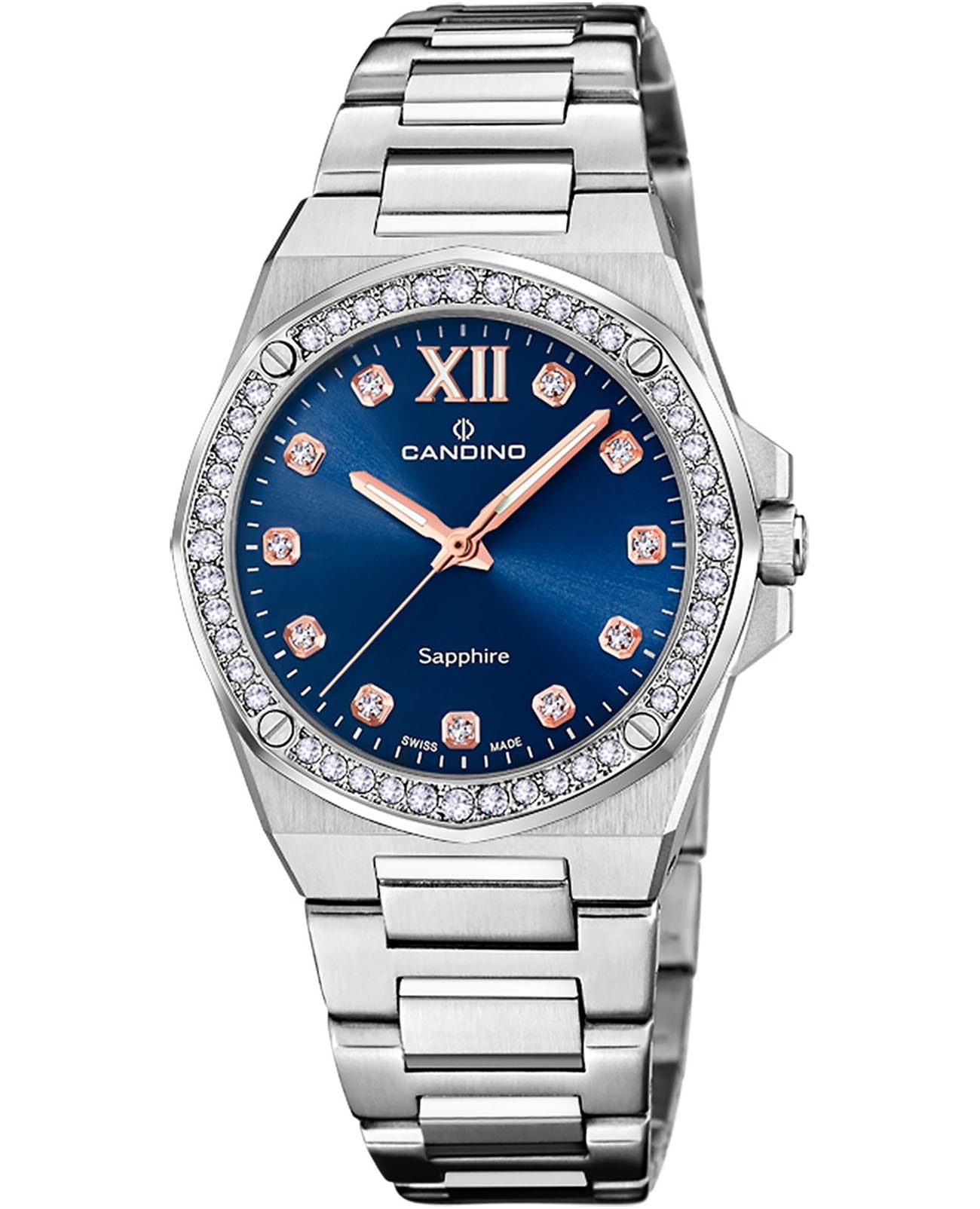 Женские наручные часы Candino Elegance C4751/3 с надёжным кварцевым механизмом. Корпус и браслет часов изготовлены из нержавеющей стали. Сапфировое стеклоСапфировое стеклоПрочный и надёжный материал из кристалла сапфира синтетического происхождения, характеризующийся особой твёрдостью и устойчивостью к царапинам и повреждениям. повышенной прозрачности, устойчивое к мелким механическим повреждениям. Стальной браслет на раскладной застёжкеРаскладная застёжкаТакой тип застёжки используется только на браслетах из металла. Она никогда не раскрывается полностью, происходит разделение на 2 и более частей. Раскладывающая застёжка снизит вероятность потери часов к минимуму.. Стрелки и метки с люминесцентным покрытиемЛюминесцентное покрытиеПозволяет считывать показания времени в темноте. Производители наносят на стрелки, часовые индексы, безель или поверхность циферблата светонакопительный состав, дающий холодное свечение.. БезельБезельВнешний ободок, закрепляющий стекло. В спортивных часах так называется поворотное кольцо с делениями на циферблате, выполняет роль таймера – замеряет отрезки времени на шкале. Неподвижный безель – элемент декора. Однонаправленно вращающийся безель на дайверских часах позволяет фиксировать моменты погружения и выныривания на поверхность. и циферблат инкрустированы кристаллами. Класс водозащиты: 50 метров, позволит защитить корпус от случайных брызг или капель дождя.