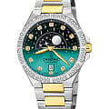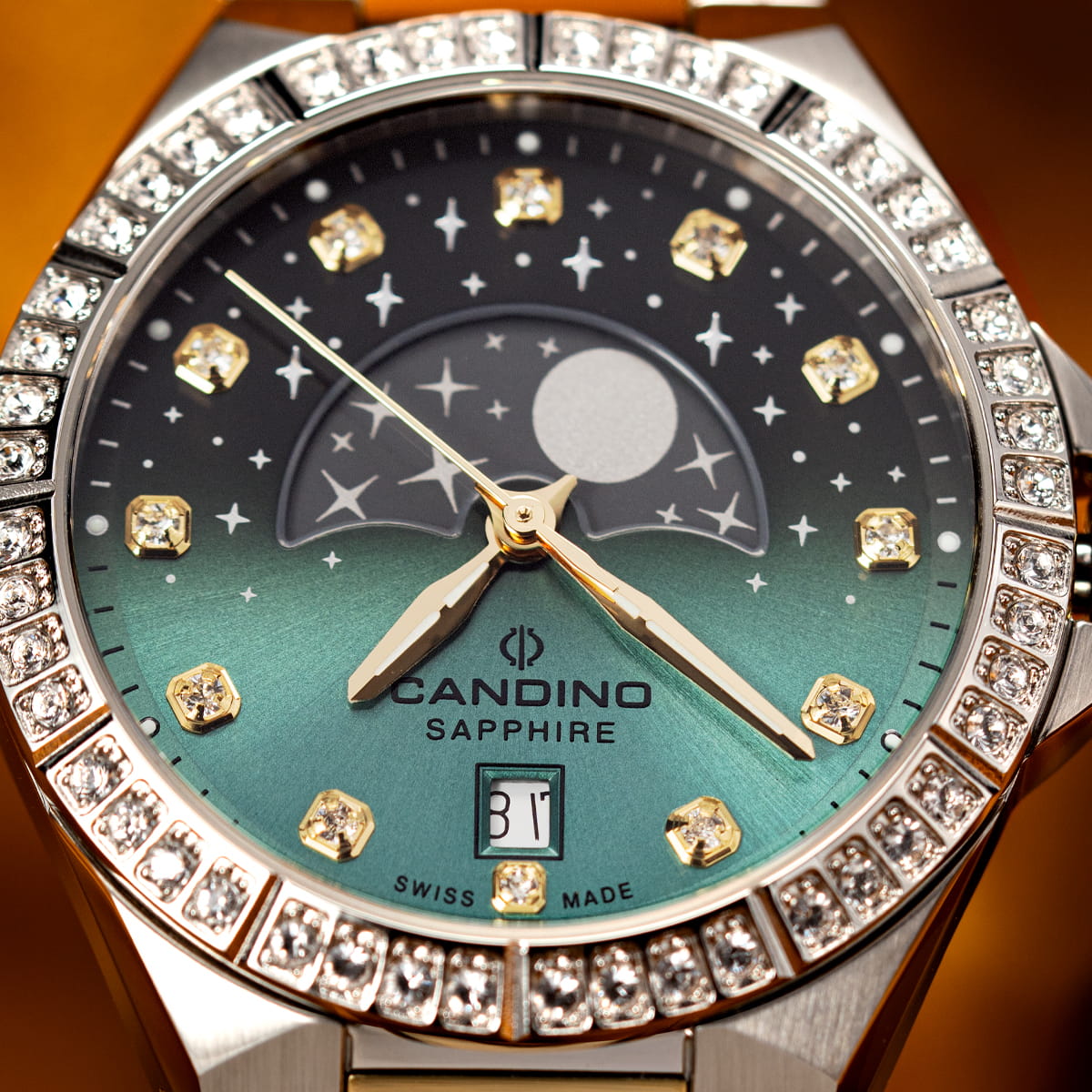 Женские наручные часы Candino Lady Elegance Moonphase C4761/2 с надёжным кварцевым механизмом. Корпус и браслет часов изготовлены из нержавеющей стали. Сапфировое стеклоСапфировое стеклоПрочный и надёжный материал из кристалла сапфира синтетического происхождения, характеризующийся особой твёрдостью и устойчивостью к царапинам и повреждениям. повышенной прозрачности, устойчивое к мелким механическим повреждениям. Стальной браслет с частичным PVD-покрытиемPVDУльтратонкое покрытие наносится в технике вакуумного напыления, сочетает в себе нитрид титана особой прочности со слоем золота или оксида хрома. Несёт в себе декоративную или защитную функцию. на раскладной застёжкеРаскладная застёжкаТакой тип застёжки используется только на браслетах из металла. Она никогда не раскрывается полностью, происходит разделение на 2 и более частей. Раскладывающая застёжка снизит вероятность потери часов к минимуму.. Стрелки и метки с люминесцентным покрытиемЛюминесцентное покрытиеПозволяет считывать показания времени в темноте. Производители наносят на стрелки, часовые индексы, безель или поверхность циферблата светонакопительный состав, дающий холодное свечение.. Двухцветный циферблат с индикатором фазы луны и безельБезельВнешний ободок, закрепляющий стекло. В спортивных часах так называется поворотное кольцо с делениями на циферблате, выполняет роль таймера – замеряет отрезки времени на шкале. Неподвижный безель – элемент декора. Однонаправленно вращающийся безель на дайверских часах позволяет фиксировать моменты погружения и выныривания на поверхность. инкрустированы цирконами. Класс водозащиты: 50 метров, позволит защитить корпус от случайных брызг или капель дождя. Окошко даты находится в положении 6 часов.