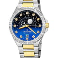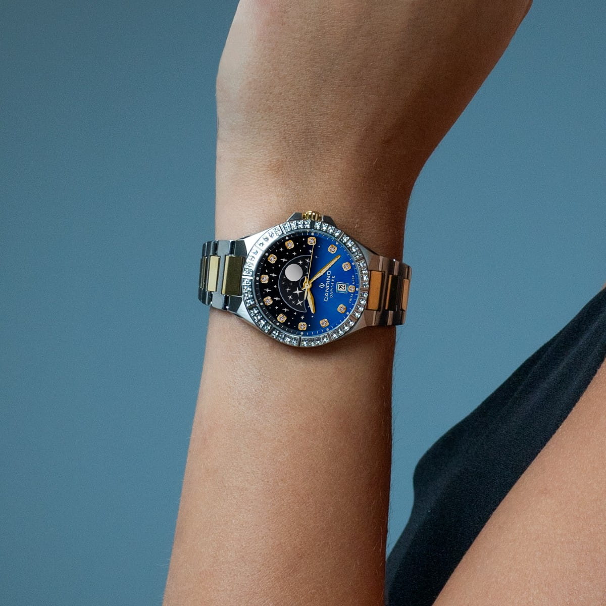 Женские наручные часы Candino Lady Elegance Moonphase C4761/3 с надёжным кварцевым механизмом. Корпус и браслет часов изготовлены из нержавеющей стали. Сапфировое стеклоСапфировое стеклоПрочный и надёжный материал из кристалла сапфира синтетического происхождения, характеризующийся особой твёрдостью и устойчивостью к царапинам и повреждениям. повышенной прозрачности, устойчивое к мелким механическим повреждениям. Стальной браслет с частичным PVD-покрытиемPVDУльтратонкое покрытие наносится в технике вакуумного напыления, сочетает в себе нитрид титана особой прочности со слоем золота или оксида хрома. Несёт в себе декоративную или защитную функцию. на раскладной застёжкеРаскладная застёжкаТакой тип застёжки используется только на браслетах из металла. Она никогда не раскрывается полностью, происходит разделение на 2 и более частей. Раскладывающая застёжка снизит вероятность потери часов к минимуму.. Стрелки и метки с люминесцентным покрытиемЛюминесцентное покрытиеПозволяет считывать показания времени в темноте. Производители наносят на стрелки, часовые индексы, безель или поверхность циферблата светонакопительный состав, дающий холодное свечение.. Двухцветный циферблат с индикатором фазы луны и безельБезельВнешний ободок, закрепляющий стекло. В спортивных часах так называется поворотное кольцо с делениями на циферблате, выполняет роль таймера – замеряет отрезки времени на шкале. Неподвижный безель – элемент декора. Однонаправленно вращающийся безель на дайверских часах позволяет фиксировать моменты погружения и выныривания на поверхность. инкрустированы цирконами. Класс водозащиты: 50 метров, позволит защитить корпус от случайных брызг или капель дождя. Окошко даты находится в положении 6 часов.