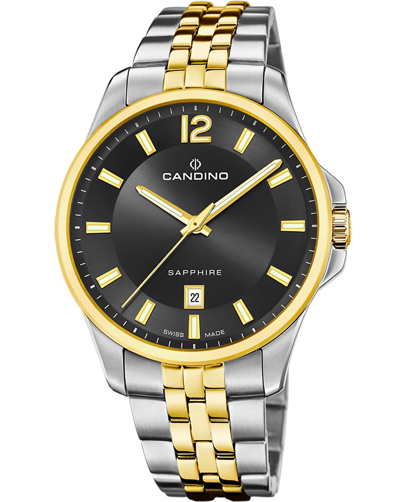 Мужские швейцарские часы с сапфировым стекломСапфировое стеклоПрочный и надёжный материал из кристалла сапфира синтетического происхождения, характеризующийся особой твёрдостью и устойчивостью к царапинам и повреждениям. Candino Gents Classic C4765/4, кварцевый механизм с высокой точностью. Класс водозащиты: 50 метров, позволит защитить корпус от случайных брызг или капель дождя. Корпус и браслет часов изготовлены из нержавеющей стали. Стальной браслет с частичным PVD-покрытиемPVDУльтратонкое покрытие наносится в технике вакуумного напыления, сочетает в себе нитрид титана особой прочности со слоем золота или оксида хрома. Несёт в себе декоративную или защитную функцию. на раскладной застёжкеРаскладная застёжкаТакой тип застёжки используется только на браслетах из металла. Она никогда не раскрывается полностью, происходит разделение на 2 и более частей. Раскладывающая застёжка снизит вероятность потери часов к минимуму.. Стрелки и метки с люминесцентным покрытиемЛюминесцентное покрытиеПозволяет считывать показания времени в темноте. Производители наносят на стрелки, часовые индексы, безель или поверхность циферблата светонакопительный состав, дающий холодное свечение.. Окошко даты находится в положении 6 часов. Класс водозащиты: 50 метров, позволит защитить корпус от случайных брызг или капель дождя.