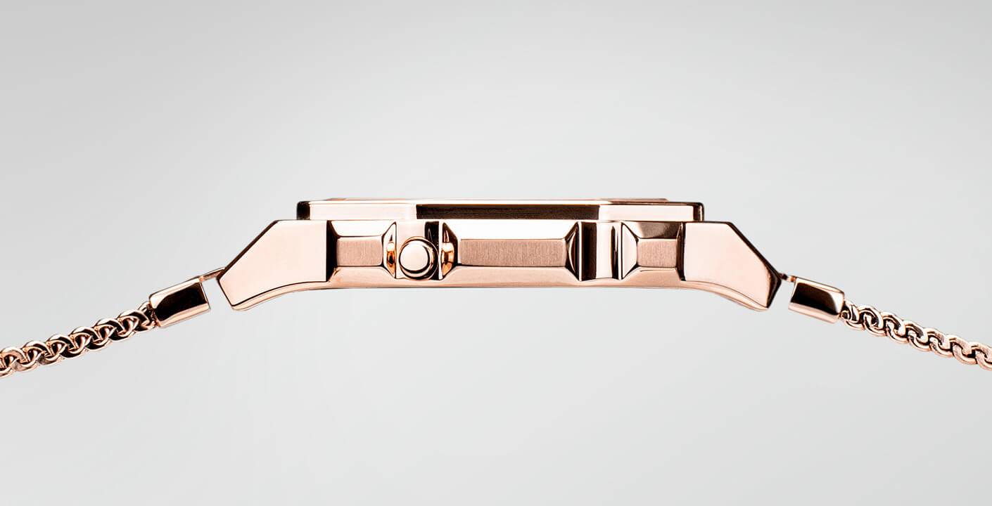 Уже известный 8-угольный ударопрочный корпусУдаропрочный корпусМеханизм заключён в корпус, выполненный из современных материалов, устойчивых к ударам, механическим повреждениям и падению с высоты: инновационный пластик, карбон, нержавеющая сталь, титан. выполнен из нержавеющей стали 316L, как и стильный браслет миланского плетения. Оригинально выглядит переливающаяся вставка, окружающая цифровое окошко. Кварцевый высокоточный механизм работает от батарейки, аккумулятор рассчитан на 3 года эксплуатации. Светодиодная подсветкаСветодиодная подсветкаСветодиодная или LED-подсветка обеспечивает появление яркого холодного свечения за счёт LED-элементов - маленьких лампочек. Они потребляют минимальное количество энергии, чаще всего можно встретить 1 светодиод, в нижней части циферблата. дисплея. Долговечное IP-покрытиеIP-покрытиеМетод ионного напыления. Демонстрирует повышенную устойчивость к истиранию, окислению и химическим веществам. Под воздействием высокого давления и температуры около 1500°C молекулы металла надёжно соединяются с частицами корпуса часов. цвета розового золота. Минеральное стекло устойчиво к появлению царапин. Автоматический календарь, будильник, секундомер. Габариты: 38 x 39,6 x 7,3 мм.