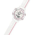 Розовые детали выигрышно смотрятся на белом фоне, стильная модель в спортивном стиле всегда будет на пике популярности. Одной из особенностей аксессуара является шагомер, позволяющий ежедневно отслеживать свою физическую активность. Можно устанавливать цель на определённое количество шагов: вокруг безеляБезельВнешний ободок, закрепляющий стекло. В спортивных часах так называется поворотное кольцо с делениями на циферблате, выполняет роль таймера – замеряет отрезки времени на шкале. Неподвижный безель – элемент декора. Однонаправленно вращающийся безель на дайверских часах позволяет фиксировать моменты погружения и выныривания на поверхность. расположилась специальная разметка, многофункциональная секундная стрелка покажет выполнение плана в процентах. Японский кварцевый механизм с точностью хода +/- 15 секунд в месяц. Срок службы аккумулятора составляет 2 года. Ударопрочный корпусУдаропрочный корпусМеханизм заключён в корпус, выполненный из современных материалов, устойчивых к ударам, механическим повреждениям и падению с высоты: инновационный пластик, карбон, нержавеющая сталь, титан. и браслет из полимерного пластика. Минеральное стекло. СветодиоднаяСветодиодная подсветкаСветодиодная или LED-подсветка обеспечивает появление яркого холодного свечения за счёт LED-элементов - маленьких лампочек. Они потребляют минимальное количество энергии, чаще всего можно встретить 1 светодиод, в нижней части циферблата. и люминесцентнаяЛюминесцентное покрытиеПозволяет считывать показания времени в темноте. Производители наносят на стрелки, часовые индексы, безель или поверхность циферблата светонакопительный состав, дающий холодное свечение. подсветка. Водонепроницаемость до 10 бар. Включение и выключение звука кнопок. Будильник с функцией повтора, календарь до 2099 года, секундомер с точностью в 1/100 секунды, таймер. Габариты: 42,6 x 45,2 x 13,3 мм.