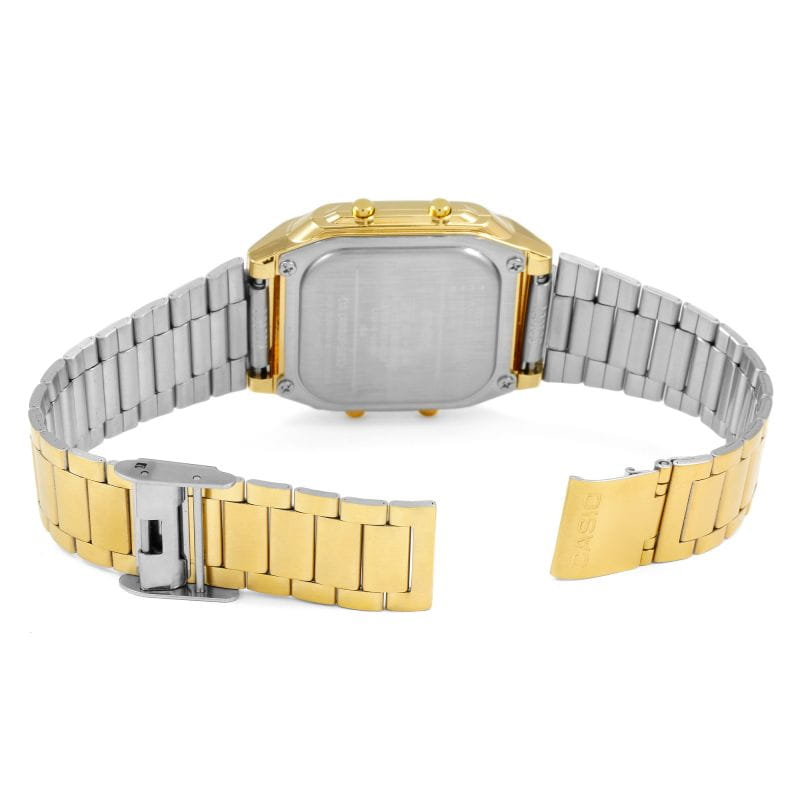 Наручные часы от Casio будут одинаково привлекательно смотреться как с деловым костюмом, так и с повседневным образом. Яркий дизайн выдержан в стиле винтаж. Корпус сделан из высокопрочного пластика. Браслет выполнен из стали с PVDPVDУльтратонкое покрытие наносится в технике вакуумного напыления, сочетает в себе нитрид титана особой прочности со слоем золота или оксида хрома. Несёт в себе декоративную или защитную функцию. покрытием. Благодаря раскладывающейся застёжкеРаскладная застёжкаТакой тип застёжки используется только на браслетах из металла. Она никогда не раскрывается полностью, происходит разделение на 2 и более частей. Раскладывающая застёжка снизит вероятность потери часов к минимуму., потеря аксессуара сведена к минимуму. Есть записная книжка, в которую можно сохранять до 30 контактов. Светодиодная подсветкаСветодиодная подсветкаСветодиодная или LED-подсветка обеспечивает появление яркого холодного свечения за счёт LED-элементов - маленьких лампочек. Они потребляют минимальное количество энергии, чаще всего можно встретить 1 светодиод, в нижней части циферблата.. Гладкая золотистая поверхность плавно отображает падающий свет и поднимает настроение.