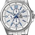 Мужские наручные часы Casio Edifice надежные и практичные. Кварцевый японский механизм Miyota. Точность хода не хуже -10 +15 сек./в месяц. Часы оснащены календарем и 24х часовым форматом времени. Циферблат белого цвета с контрастными индексами. Стрелки и индексы с светонакопительным нанесением. Корпус и браслет выполнены из нержавеющей стали. Минеральное стекло устойчиво к появлению царапин. Водонепроницаемость 100М. В часах можно плавать. Степень водонепроницаемости не является величиной, эквивалентной функциональной рабочей глубине.