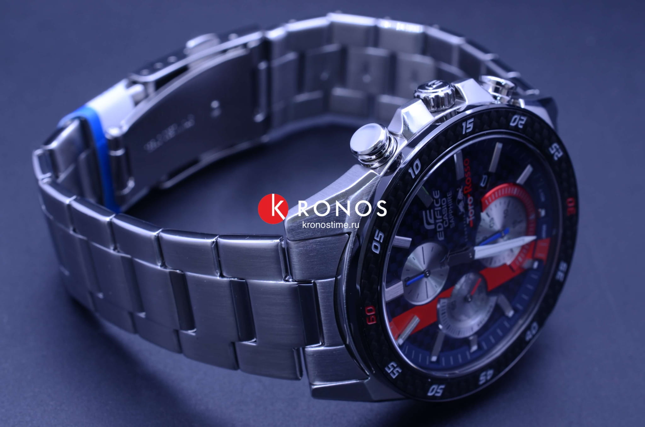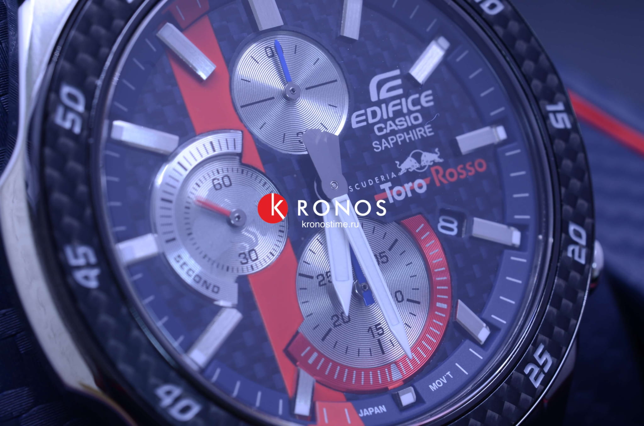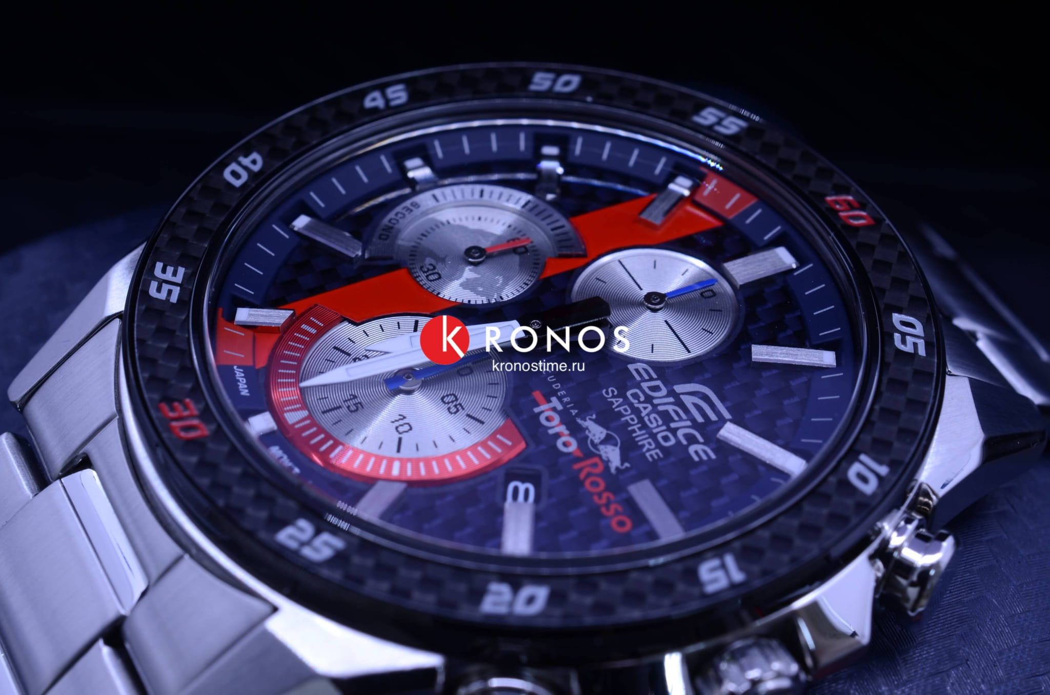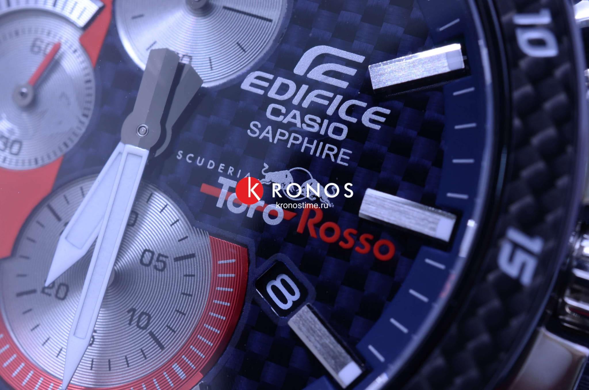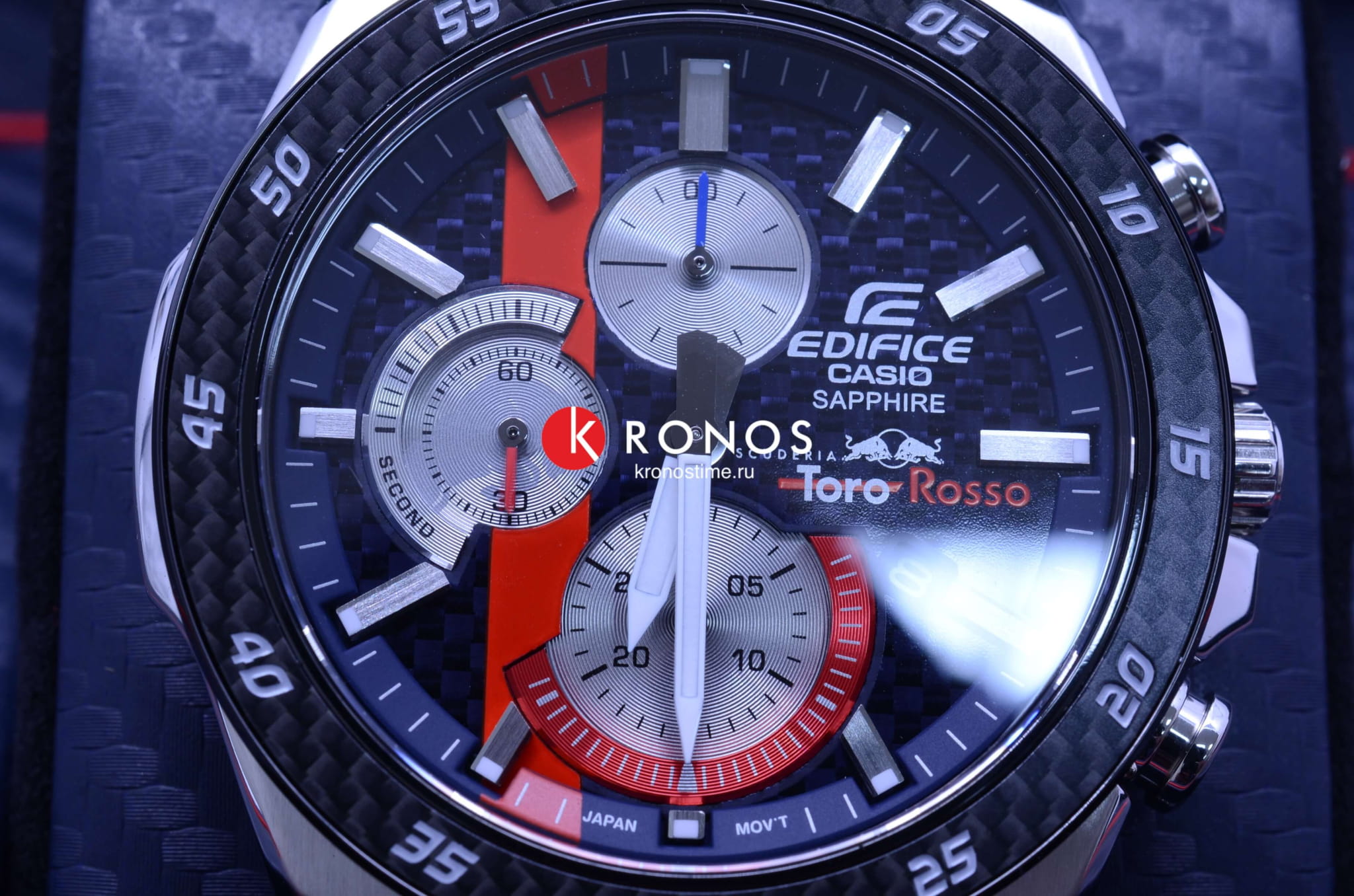 Аксессуар сочетает красный, синий, серебристые оттенки - цвета легендарного гоночного автомобиля Scuderia Toro Rosso STR14. Стальной безельБезельВнешний ободок, закрепляющий стекло. В спортивных часах так называется поворотное кольцо с делениями на циферблате, выполняет роль таймера – замеряет отрезки времени на шкале. Неподвижный безель – элемент декора. Однонаправленно вращающийся безель на дайверских часах позволяет фиксировать моменты погружения и выныривания на поверхность. с оригинальным узором имеет карбоновую вставку для усиления ударопрочных свойств. Срок службы батарейки составляет 5 лет без необходимости замены. Стрелки и метки с люминесцентной подсветкойЛюминесцентное покрытиеПозволяет считывать показания времени в темноте. Производители наносят на стрелки, часовые индексы, безель или поверхность циферблата светонакопительный состав, дающий холодное свечение.. Подсветка экрана. Сапфировое стекло практически невозможно поцарапать. Предохранительная застёжка предотвращает случайное расстёгивание браслета. Секундомер, отображение даты. Габариты: 50,5 x 45,6 x 9,5 мм.