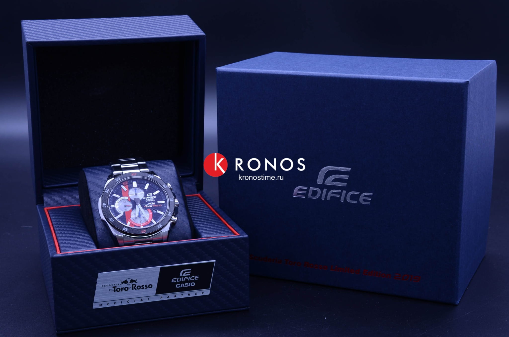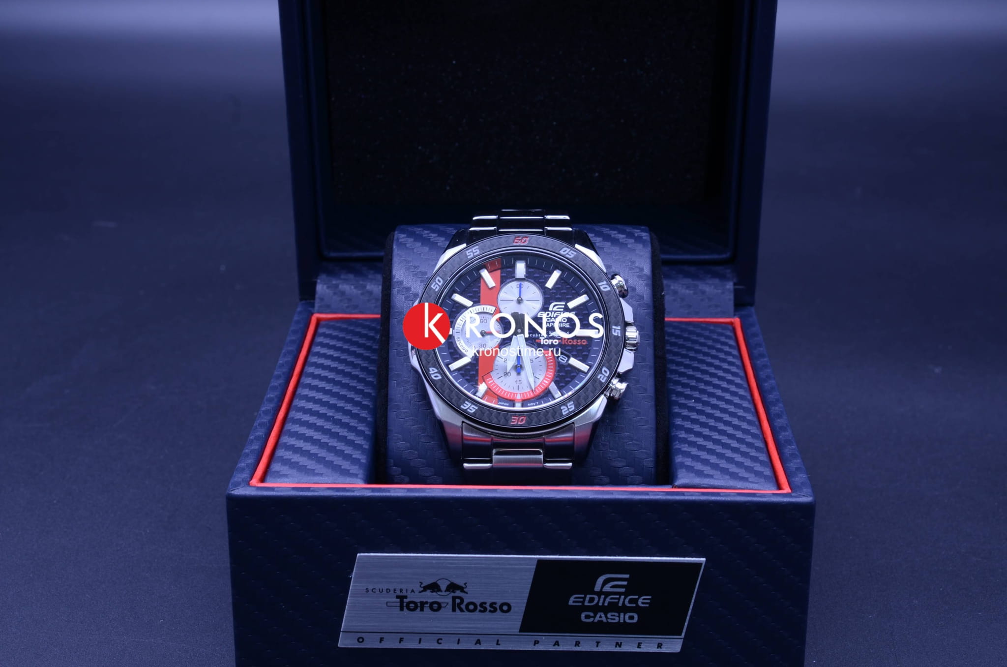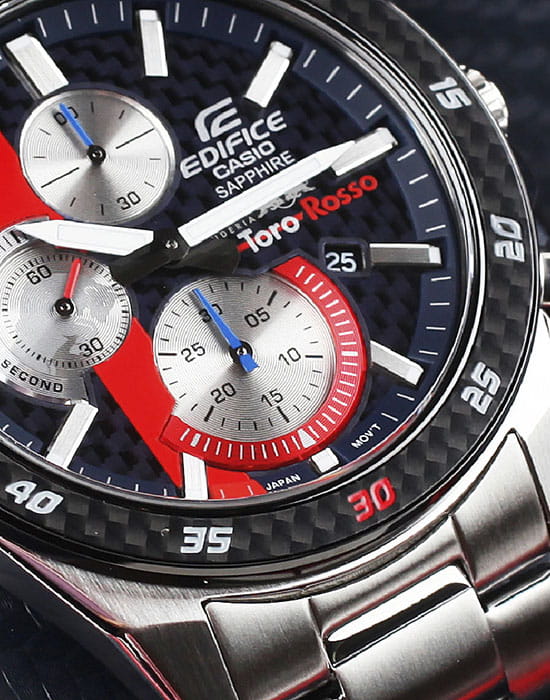 Мужские наручные часы из коллекции Edifice Limited Edition являются отражением спортивной динамики гоночной команды Scuderia Toro Rosso.