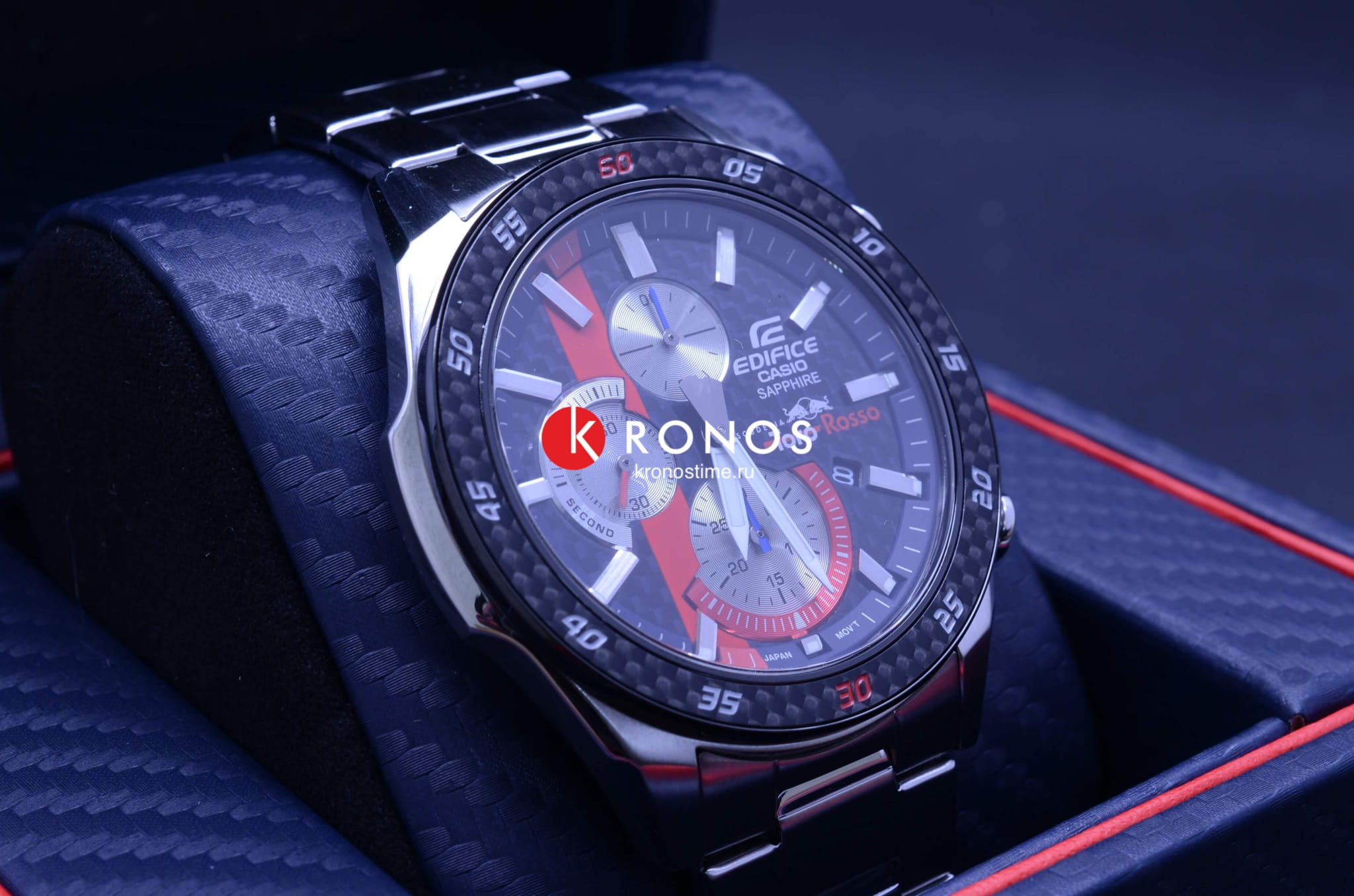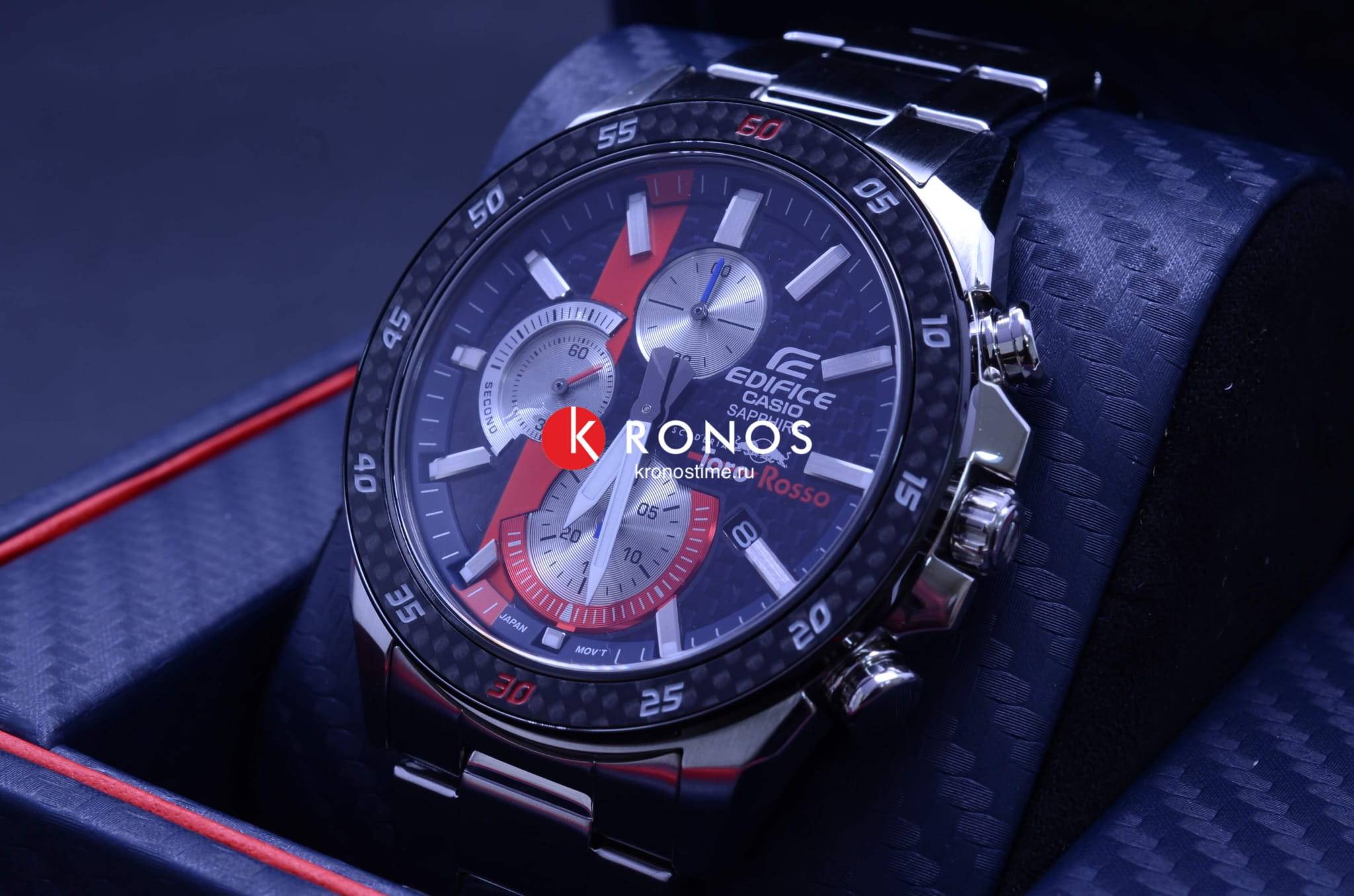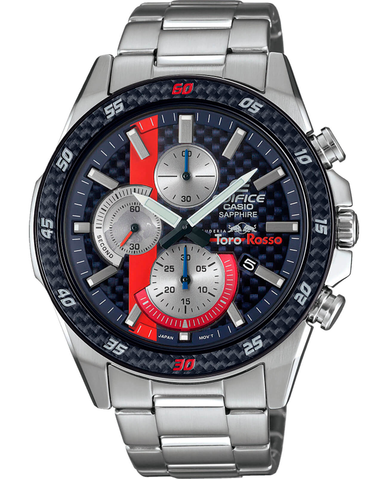 Мужские наручные часы из коллекции Edifice Limited Edition являются отражением спортивной динамики гоночной команды Scuderia Toro Rosso.