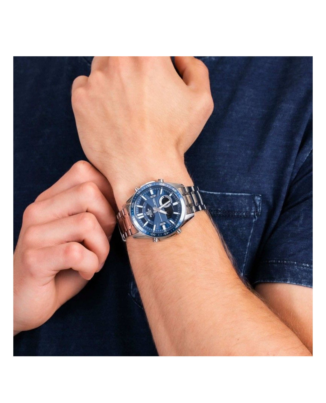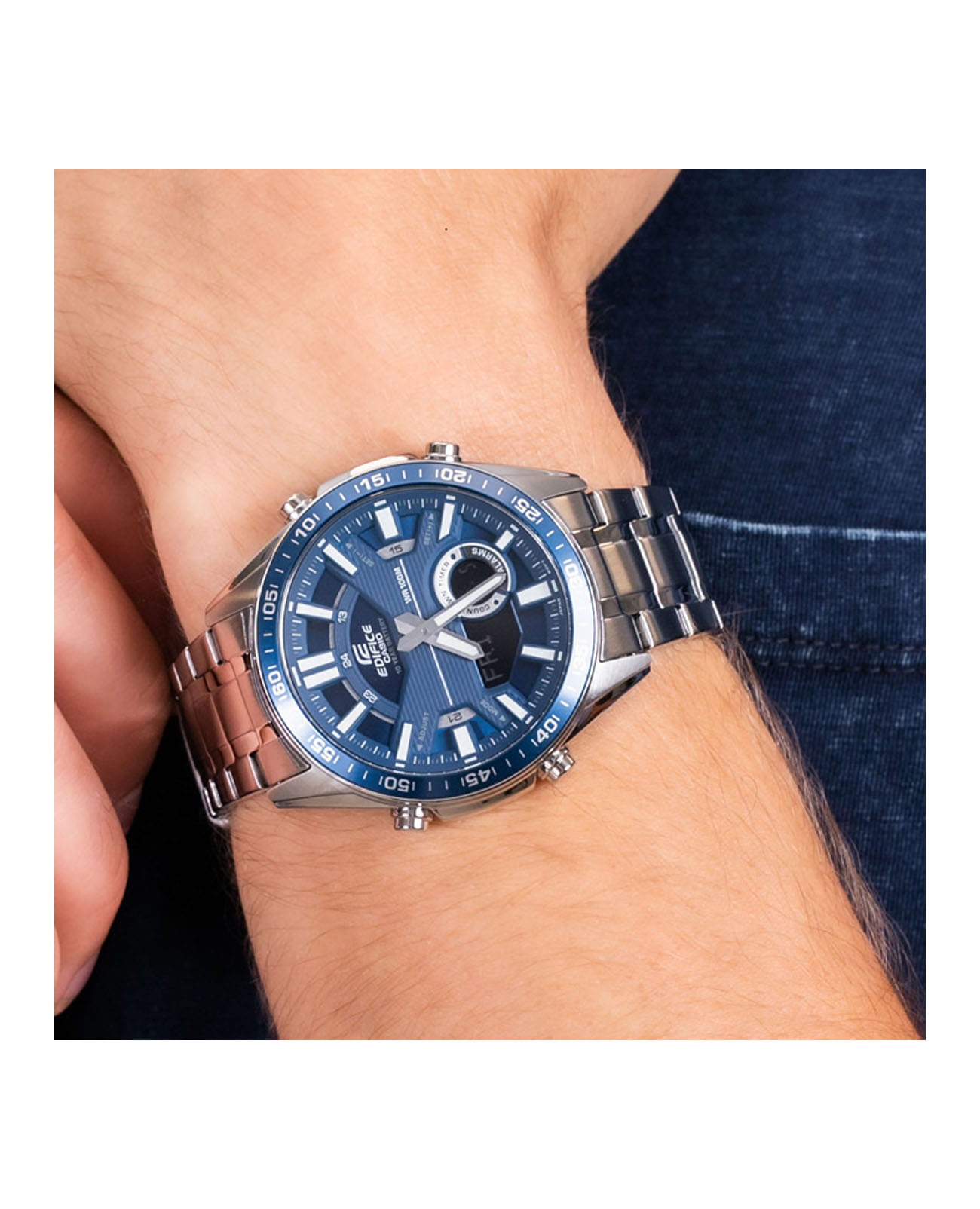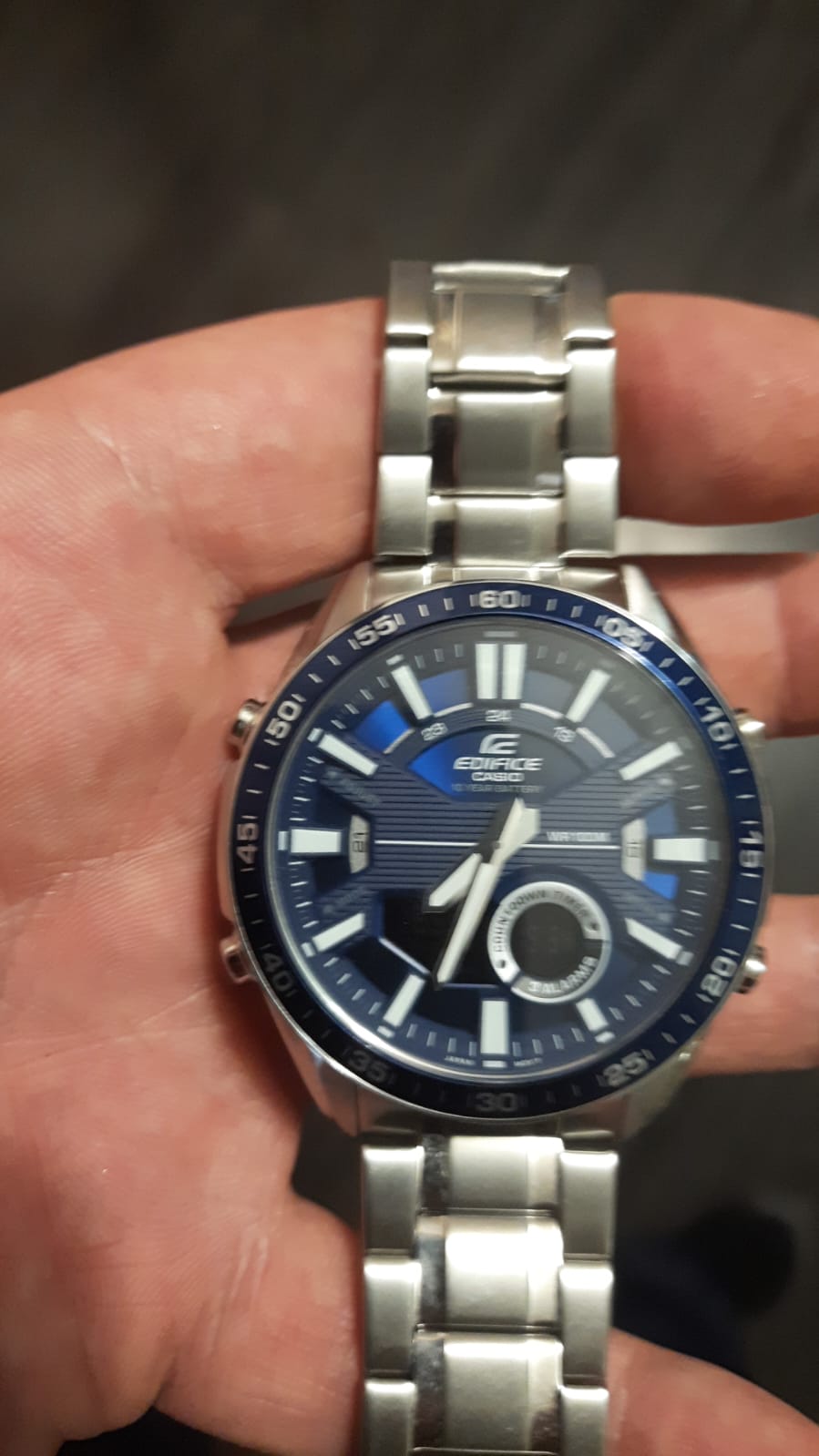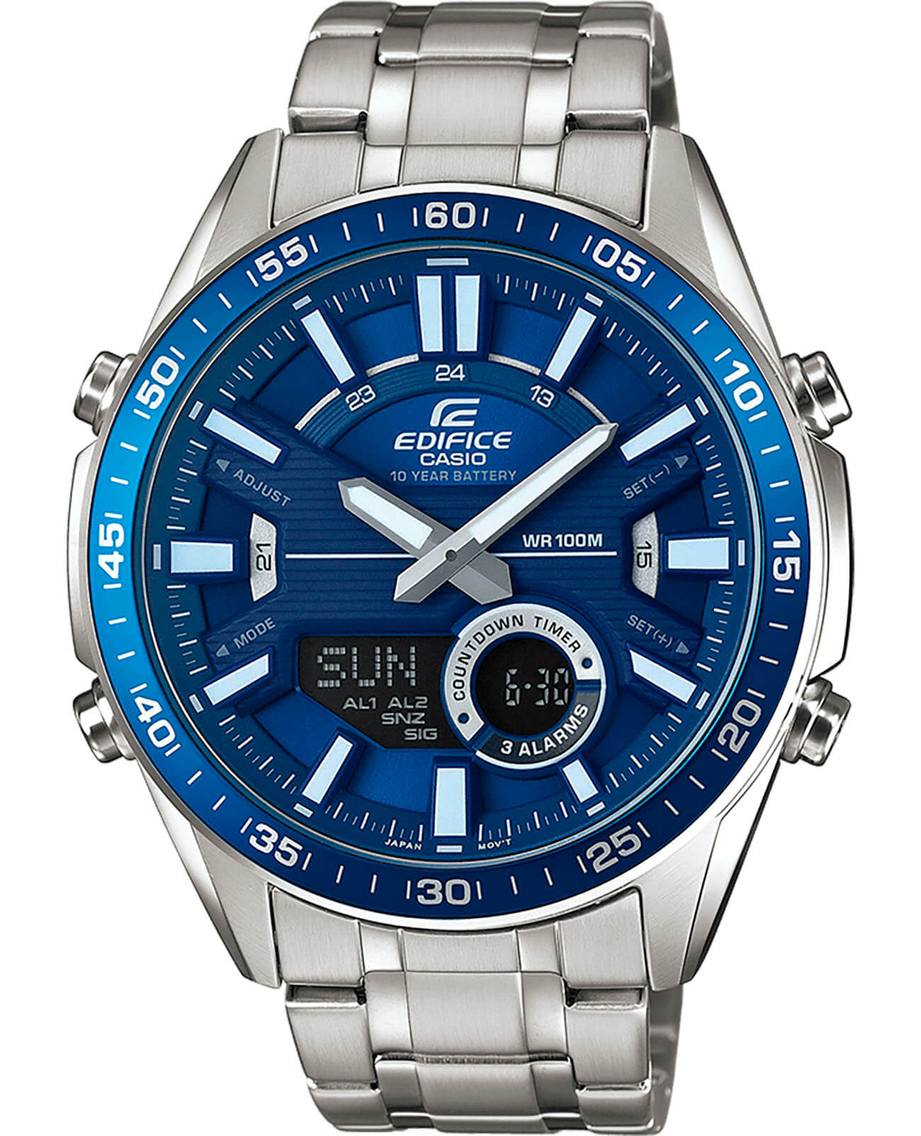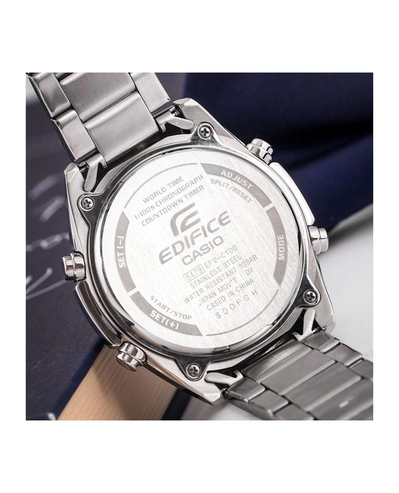 Японские мужские часы-хронографХронографФункция позволяет измерять отрезки времени с особой точностью: часы, минуты, секунды. Верным признаком хронографа является наличие на циферблате 3 дополнительных окошек-счётчиков. Casio Edifice EFV-C100D-2AVEF. Минеральное стеклоМинеральное стеклоМинеральное стекло представляет собой искусственно выращенный минерал кварца. Такое стекло отличается особой устойчивостью к повреждениям и царапинам. Уступает по некоторым качествам сапфировому стеклу. устойчивое к появлению царапин, обладающее высокой прозрачностью. Копрус часов изготовлен из нержавеющей стали. БезельБезельВнешний ободок, закрепляющий стекло. В спортивных часах так называется поворотное кольцо с делениями на циферблате, выполняет роль таймера – замеряет отрезки времени на шкале. Неподвижный безель – элемент декора. Однонаправленно вращающийся безель на дайверских часах позволяет фиксировать моменты погружения и выныривания на поверхность. из стали с IP-покрытиемIP-покрытиеМетод ионного напыления. Демонстрирует повышенную устойчивость к истиранию, окислению и химическим веществам. Под воздействием высокого давления и температуры около 1500°C молекулы металла надёжно соединяются с частицами корпуса часов.. Стрелки и метки с люминесцентным покрытиемЛюминесцентное покрытиеПозволяет считывать показания времени в темноте. Производители наносят на стрелки, часовые индексы, безель или поверхность циферблата светонакопительный состав, дающий холодное свечение. - при повороте часов в сторону лица подсветка дисплея осуществляется автоматически. Настраиваемое послесвечение 1,5 или 3сек. Записная книжка на 30 ячеек памяти для записи имен и телефонных номеров, каждая запись может включать в себя текст из 8 букв и 16 цифр. СекундомерСекундомерСекундоме́р — прибор, способный измерять интервалы времени с точностью до долей секунды. с точностью измерения 1/100 секунды и измерением до 23 часов 59 минут 59,99 cек. ТаймерТаймерОтсчитывает секунды в обратном направлении в заданном интервале времени. обратного отсчета (диапазон времени 24 часа), автоматический календарь, 12/24 отображение времени. Мировое времяМировое время Полезное часовое усложнение, отображающее время в основных городах и известных областях по всему миру, оно связано с часовыми поясами, удобно для путешественников и бизнесменов. – 30 городов (29 часовых поясов). 5 будильниковБудильникБуди́льник — часы, в заданный момент времени подающие звуковой, световой и/или в редких случаях другой сигнал., один с функцией Snooze, ежечасный сигнал. Класс водозащиты: 100 метров, позволит плавать, нырять и заниматься другими водными видами спорта. Стальной браслет на раскладной застёжкеРаскладная застёжкаТакой тип застёжки используется только на браслетах из металла. Она никогда не раскрывается полностью, происходит разделение на 2 и более частей. Раскладывающая застёжка снизит вероятность потери часов к минимуму..