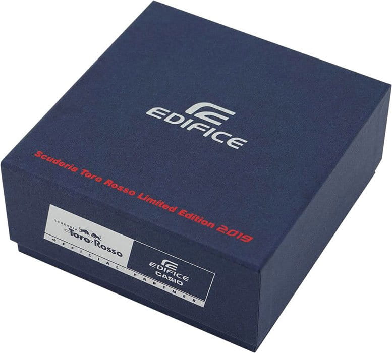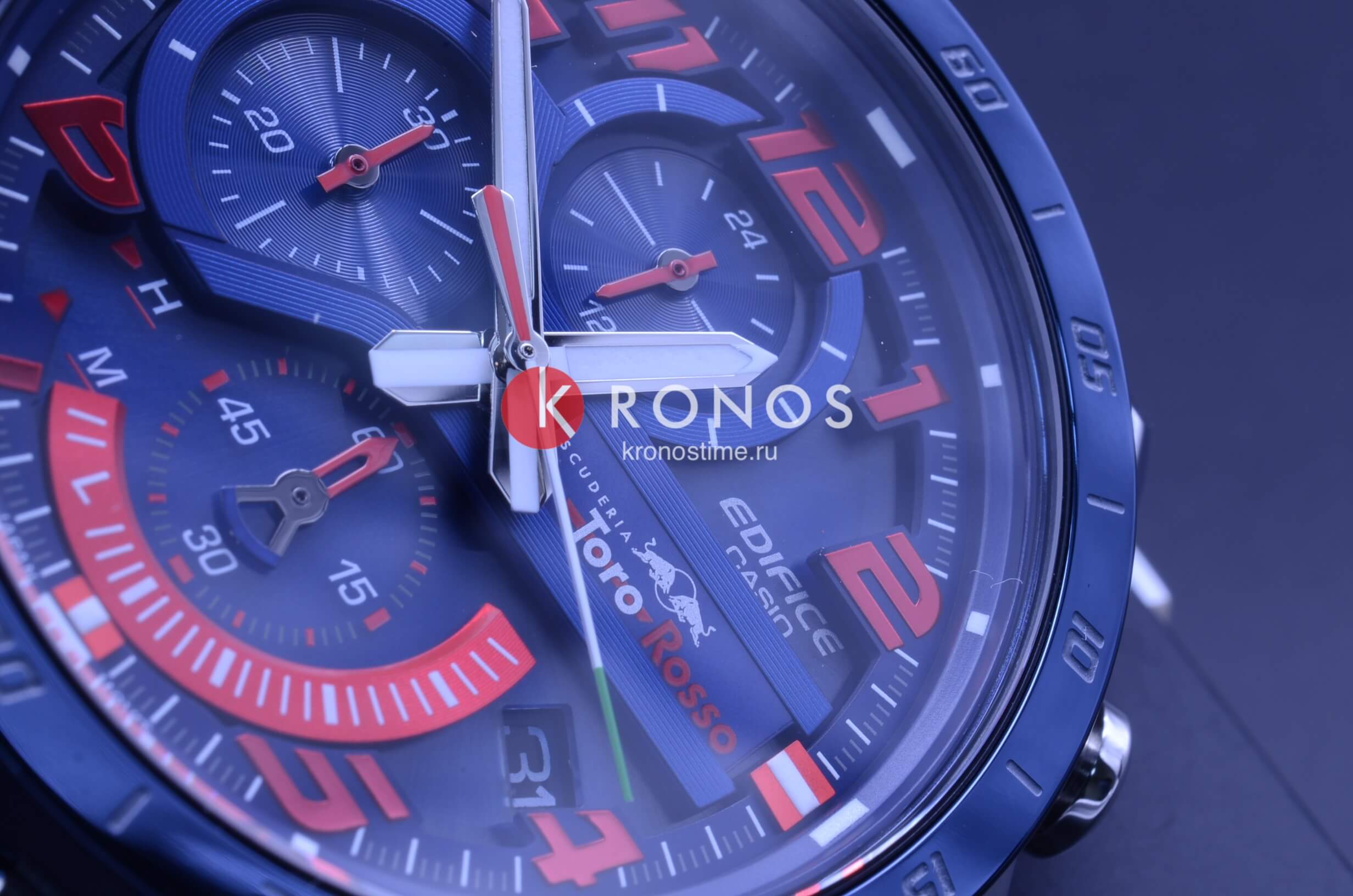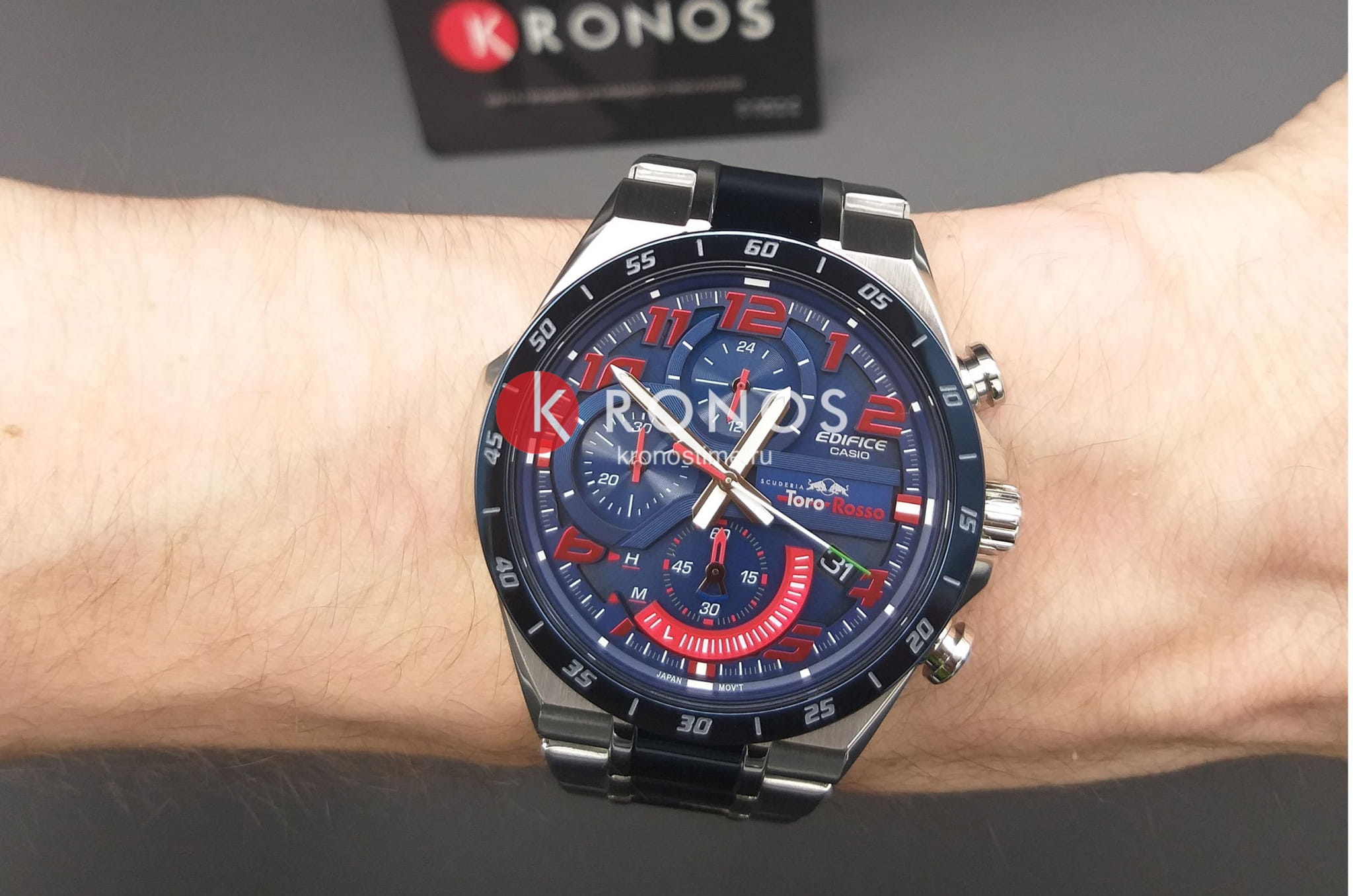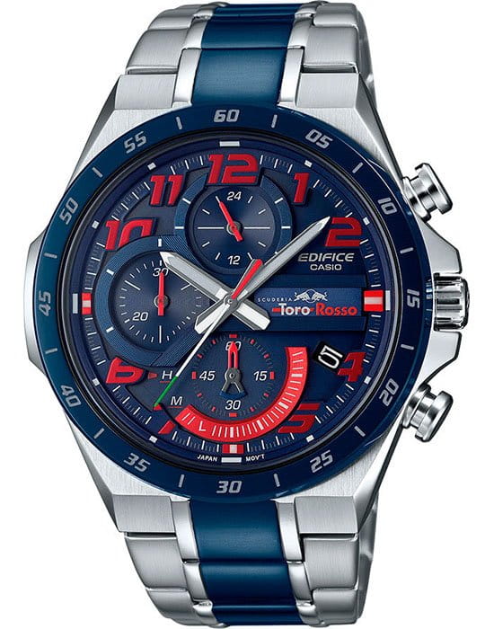 Часы посвящены итальянской команде Формулы-1 Scuderia Toro Rosso: часовые индексы написаны шрифтом, который обычно используется для номеров командных автомобилей, секундная стрелка окрашена в цвета итальянского флага, логотип команды стоит на циферблате и на задней крышке корпуса, в дизайне использованы синий, красный и серебристый – это цвета автомобилей Scuderia Toro Rosso. Прекрасный подарок поклоннику спорта, в частности – Формулы 1.