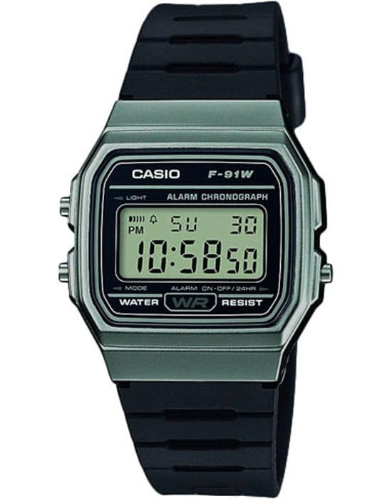 Мужские часы-хронографХронографФункция позволяет измерять отрезки времени с особой точностью: часы, минуты, секунды. Верным признаком хронографа является наличие на циферблате 3 дополнительных окошек-счётчиков. Casio Illuminator F-91WM-1B, кварцевый механизм с высокой точностью, органическое стекло. Простые и удобные в использовании часы на каждый день в популярном ретро-стиле. Циферблат подсвечивается светодиодомСветодиодная подсветкаСветодиодная или LED-подсветка обеспечивает появление яркого холодного свечения за счёт LED-элементов - маленьких лампочек. Они потребляют минимальное количество энергии, чаще всего можно встретить 1 светодиод, в нижней части циферблата.. 12-ти и 24-х часовой формат времени. СекундомерСекундомерСекундоме́р — прибор, способный измерять интервалы времени с точностью до долей секунды. с точностью показаний 1/100с и временем измерения 1ч. Батарейка рассчитана на 7 лет. Стальная задняя крышка крепится на 4-х винтах. Класс водозащиты: 30 метров, позволит защитить корпус от случайных брызг или капель дождяРемешок из полимерного материала на стандартной застежке.
