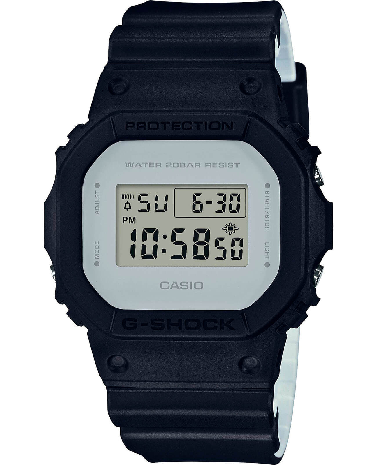 Узнаваемый олдскульный корпус в чёрном матовом исполнении гармонирует с белой окантовкой циферблата. Наручные часы станут идеальным подарком для ценителя высококачественных и практичных изделий. Работу японского кварцевого механизма обеспечивает батарейка, рассчитанная на 2 года службы. Противоударный корпусУдаропрочный корпусМеханизм заключён в корпус, выполненный из современных материалов, устойчивых к ударам, механическим повреждениям и падению с высоты: инновационный пластик, карбон, нержавеющая сталь, титан. из пластика устойчив к вибрации, падению, повреждениям. Электролюминесцентная подсветкаЭлектролюминесцентная подсветкаЭлектролюминесцентная панель устанавливается под ЖК-экраном часов, при нажатии кнопки электричество преобразуется в свет за счёт подачи напряжения на атомы фосфора, такой тип подсветки позволяет освещать весь циферблат. циферблата сине-зелёного цвета. Задняя крышка с гравировкой. Удобный полимерный ремешок. Минеральное стекло. Водостойкость до 20 бар. Функции: автоматический календарь до 2099 года, хронографХронографФункция позволяет измерять отрезки времени с особой точностью: часы, минуты, секунды. Верным признаком хронографа является наличие на циферблате 3 дополнительных окошек-счётчиков., будильник, секундомер с точностью в 1/100 секунды, таймер. Габариты: 48,9 x 42,8 x 13,4 мм.