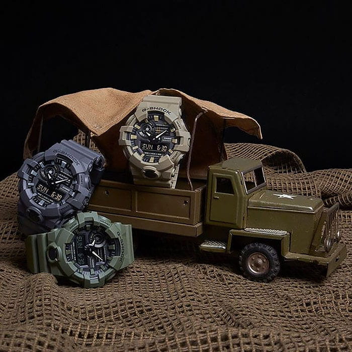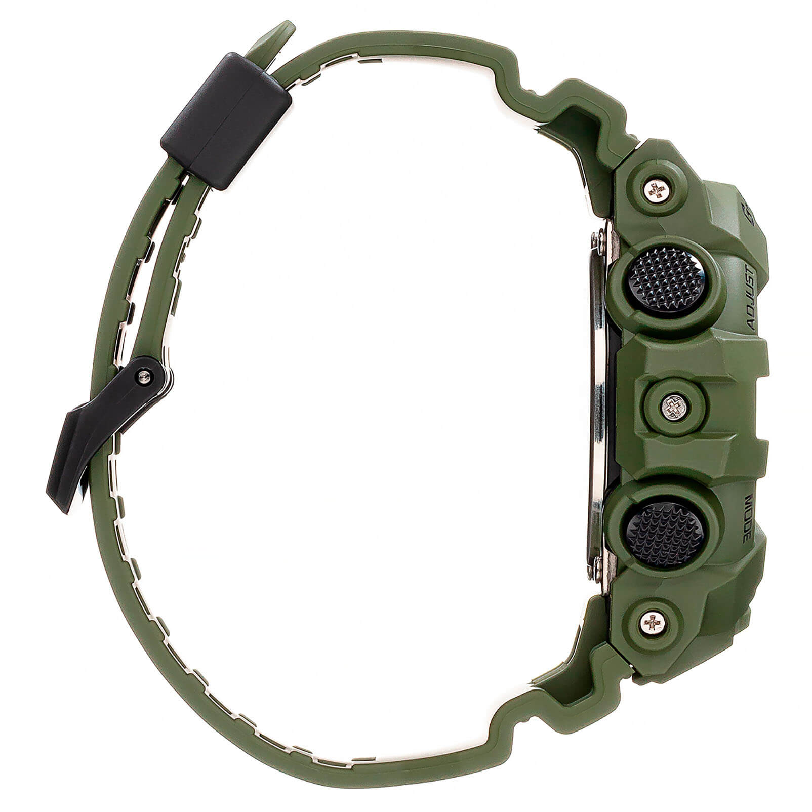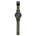 Аналого-цифровая модель в тёмно-зелёном исполнении идеально подойдёт для ношения в любой ситуации, гармонично смотрится контрастный циферблат с крупными элементами дизайна. Часы в стиле милитари из серии GA-700 обладают противоударным корпусомУдаропрочный корпусМеханизм заключён в корпус, выполненный из современных материалов, устойчивых к ударам, механическим повреждениям и падению с высоты: инновационный пластик, карбон, нержавеющая сталь, титан. из полимерного пластика, стойко переносящим любые механические повреждения. Батарейка рассчитана на 5 лет службы. Водонепроницаемость до 20 бар. Минеральное стекло устойчиво к появлению царапин. ЛюминесцентнаяЛюминесцентное покрытиеПозволяет считывать показания времени в темноте. Производители наносят на стрелки, часовые индексы, безель или поверхность циферблата светонакопительный состав, дающий холодное свечение. и светодиодная подсветкаСветодиодная подсветкаСветодиодная или LED-подсветка обеспечивает появление яркого холодного свечения за счёт LED-элементов - маленьких лампочек. Они потребляют минимальное количество энергии, чаще всего можно встретить 1 светодиод, в нижней части циферблата.. Дополнительные возможности: функция перемещения стрелок, включение и выключение звука кнопок, секундомер, мировое времяМировое время Полезное часовое усложнение, отображающее время в основных городах и известных областях по всему миру, оно связано с часовыми поясами, удобно для путешественников и бизнесменов. , таймер с автоповтором, UTCUTCВсемирное кординационное время, не имеющее привязки к географическому положению Гринвича, основывается на атомном отсчёте времени. Регулировка времени осуществляется более точно, чем устаревшее GMT.