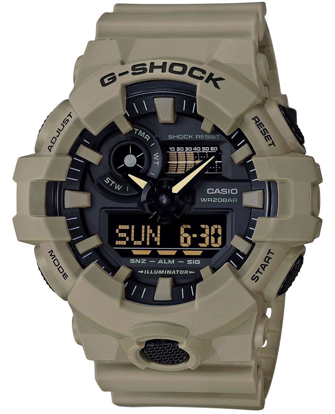 Аналого-цифровая модель в песочном исполнении идеально подойдёт для ношения в любой ситуации, гармонично смотрится контрастный циферблат с крупными элементами дизайна. Часы в стиле милитари из серии GA-700 обладают противоударным корпусомУдаропрочный корпусМеханизм заключён в корпус, выполненный из современных материалов, устойчивых к ударам, механическим повреждениям и падению с высоты: инновационный пластик, карбон, нержавеющая сталь, титан. из полимерного пластика, стойко переносящим любые механические повреждения. Батарейка рассчитана на 5 лет службы. Водонепроницаемость до 20 бар. Минеральное стекло устойчиво к появлению царапин. ЛюминесцентнаяЛюминесцентное покрытиеПозволяет считывать показания времени в темноте. Производители наносят на стрелки, часовые индексы, безель или поверхность циферблата светонакопительный состав, дающий холодное свечение. и светодиодная подсветкаСветодиодная подсветкаСветодиодная или LED-подсветка обеспечивает появление яркого холодного свечения за счёт LED-элементов - маленьких лампочек. Они потребляют минимальное количество энергии, чаще всего можно встретить 1 светодиод, в нижней части циферблата.. Дополнительные возможности: функция перемещения стрелок, включение и выключение звука кнопок, секундомер, мировое времяМировое время Полезное часовое усложнение, отображающее время в основных городах и известных областях по всему миру, оно связано с часовыми поясами, удобно для путешественников и бизнесменов. , таймер с автоповтором, UTCUTCВсемирное кординационное время, не имеющее привязки к географическому положению Гринвича, основывается на атомном отсчёте времени. Регулировка времени осуществляется более точно, чем устаревшее GMT.