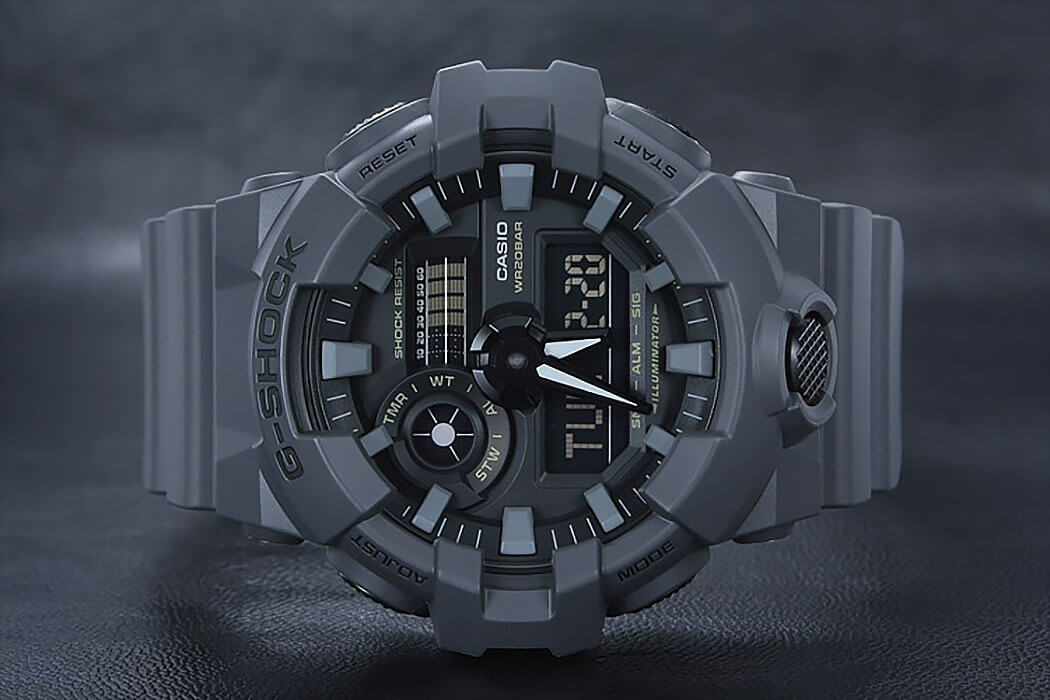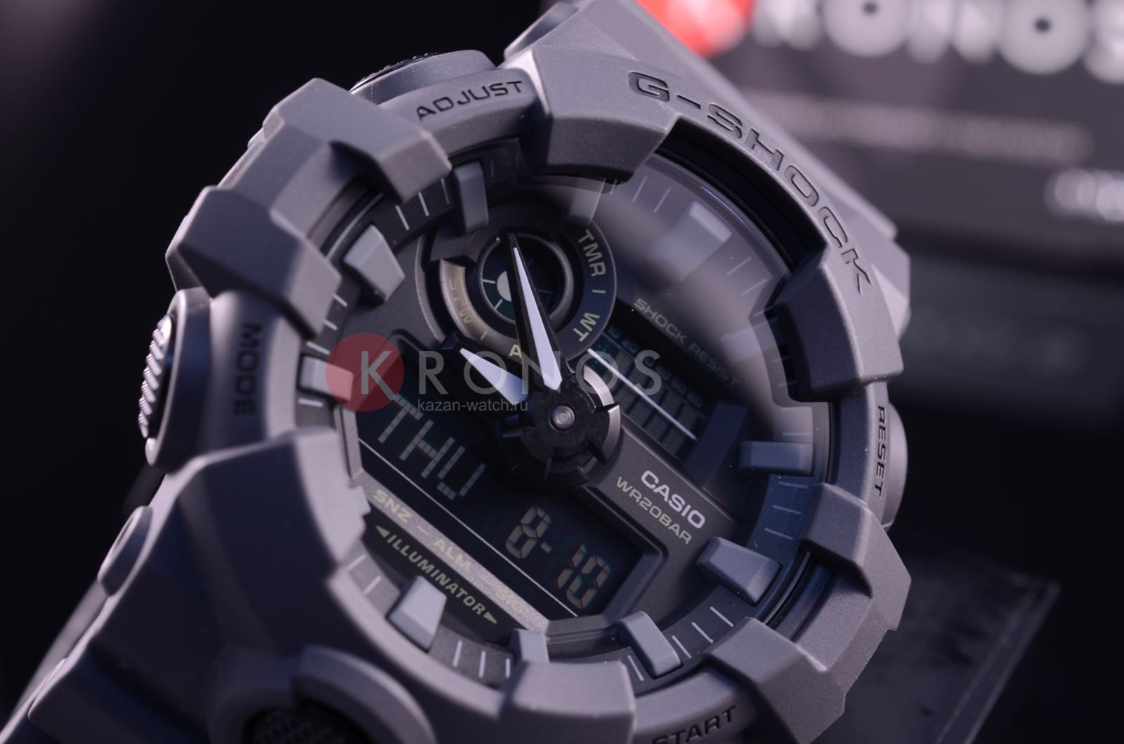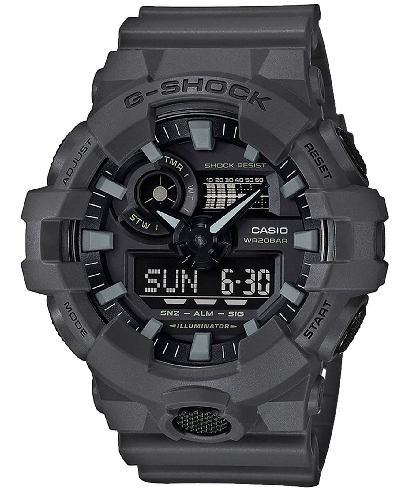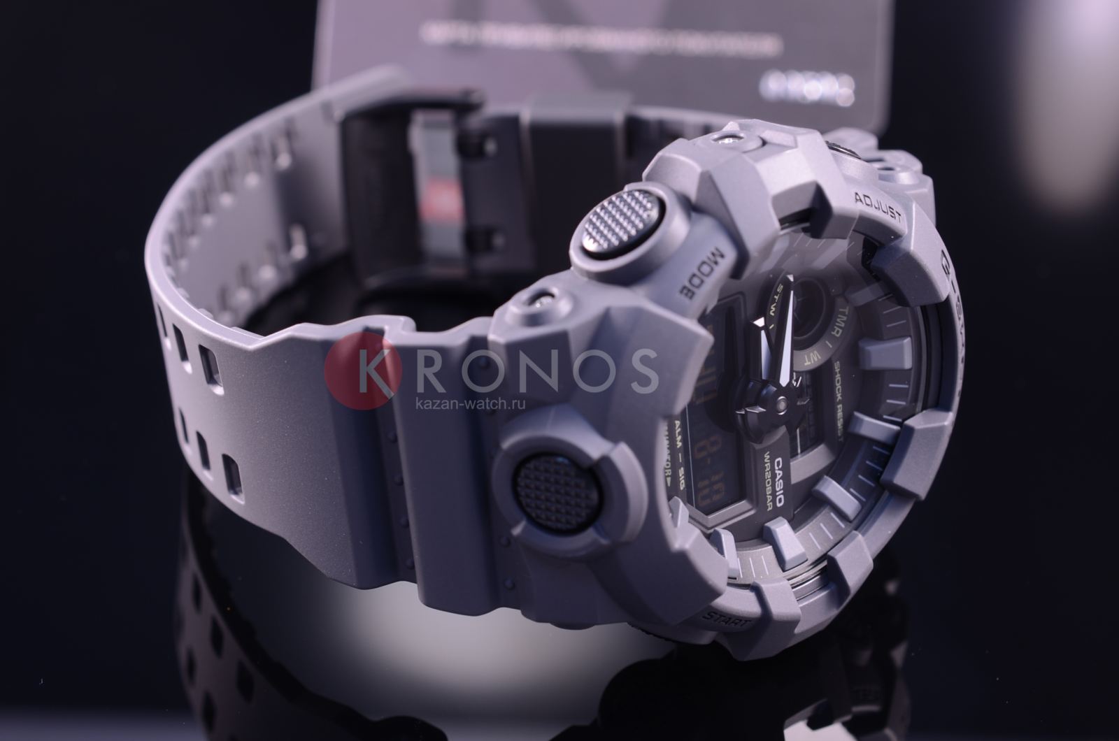 Аналого-цифровая модель в лаконичном сером исполнении идеально подойдёт для ношения в любой ситуации, гармонично смотрится контрастный циферблат с крупными элементами дизайна. Часы в стиле милитари из серии GA-700 обладают противоударным корпусомУдаропрочный корпусМеханизм заключён в корпус, выполненный из современных материалов, устойчивых к ударам, механическим повреждениям и падению с высоты: инновационный пластик, карбон, нержавеющая сталь, титан. из полимерного пластика, стойко переносящим любые механические повреждения. Батарейка рассчитана на 5 лет службы. Водонепроницаемость до 20 бар. Минеральное стекло устойчиво к появлению царапин. ЛюминесцентнаяЛюминесцентное покрытиеПозволяет считывать показания времени в темноте. Производители наносят на стрелки, часовые индексы, безель или поверхность циферблата светонакопительный состав, дающий холодное свечение. и светодиодная подсветкаСветодиодная подсветкаСветодиодная или LED-подсветка обеспечивает появление яркого холодного свечения за счёт LED-элементов - маленьких лампочек. Они потребляют минимальное количество энергии, чаще всего можно встретить 1 светодиод, в нижней части циферблата.. Дополнительные возможности: функция перемещения стрелок, включение и выключение звука кнопок, секундомер, мировое времяМировое время Полезное часовое усложнение, отображающее время в основных городах и известных областях по всему миру, оно связано с часовыми поясами, удобно для путешественников и бизнесменов. , таймер с автоповтором, UTCUTCВсемирное кординационное время, не имеющее привязки к географическому положению Гринвича, основывается на атомном отсчёте времени. Регулировка времени осуществляется более точно, чем устаревшее GMT.