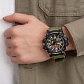 Японские мужские часы-хронографХронографФункция позволяет измерять отрезки времени с особой точностью: часы, минуты, секунды. Верным признаком хронографа является наличие на циферблате 3 дополнительных окошек-счётчиков. Casio G-Shock GG-1000-1A3 из коллекции G-Shock. При создании этой модели были учтены экстремальные ситуации, с которыми сталкиваются владельцы часов в суровых условиях пустыни. Mudmaster. Индикатор низкого заряда батареи. Минеральное стеклоМинеральное стеклоМинеральное стекло представляет собой искусственно выращенный минерал кварца. Такое стекло отличается особой устойчивостью к повреждениям и царапинам. Уступает по некоторым качествам сапфировому стеклу. устойчивое к появлению царапин, обладающее высокой прозрачностью. Ударопрочный корпусУдаропрочный корпусМеханизм заключён в корпус, выполненный из современных материалов, устойчивых к ударам, механическим повреждениям и падению с высоты: инновационный пластик, карбон, нержавеющая сталь, титан. защищает механизм от ударов и вибрации. Светодиодная подсветкаСветодиодная подсветкаСветодиодная или LED-подсветка обеспечивает появление яркого холодного свечения за счёт LED-элементов - маленьких лампочек. Они потребляют минимальное количество энергии, чаще всего можно встретить 1 светодиод, в нижней части циферблата. освещает весь циферблат. Мировое времяМировое время Полезное часовое усложнение, отображающее время в основных городах и известных областях по всему миру, оно связано с часовыми поясами, удобно для путешественников и бизнесменов. – 48 городов (29 часовых поясов). СекундомерСекундомерСекундоме́р — прибор, способный измерять интервалы времени с точностью до долей секунды. с точностью измерения 1/100 секунды и измерением до 23 часов 59 минут 59,99 cек. ТаймерТаймерОтсчитывает секунды в обратном направлении в заданном интервале времени. обратного отсчета (диапазон времени 24 часа), автоматический календарь, 12/24 отображение времени. 5 будильникаБудильникБуди́льник — часы, в заданный момент времени подающие звуковой, световой и/или в редких случаях другой сигнал., один с функцией Snooze, ежечасный сигнал. Встроенный цифровой компас. Диапазон измерения от 0° до 359° с точностью 1°. Коррекция магнитного склонения. Встроенный датчик температуры от -10° до +60°С с точностью 0,1°C.  Класс водозащиты: 200 метров, позволит плавать, нырять и заниматься другими водными видами спорта. Ремешок из полимерного материала на стандартной застежке.