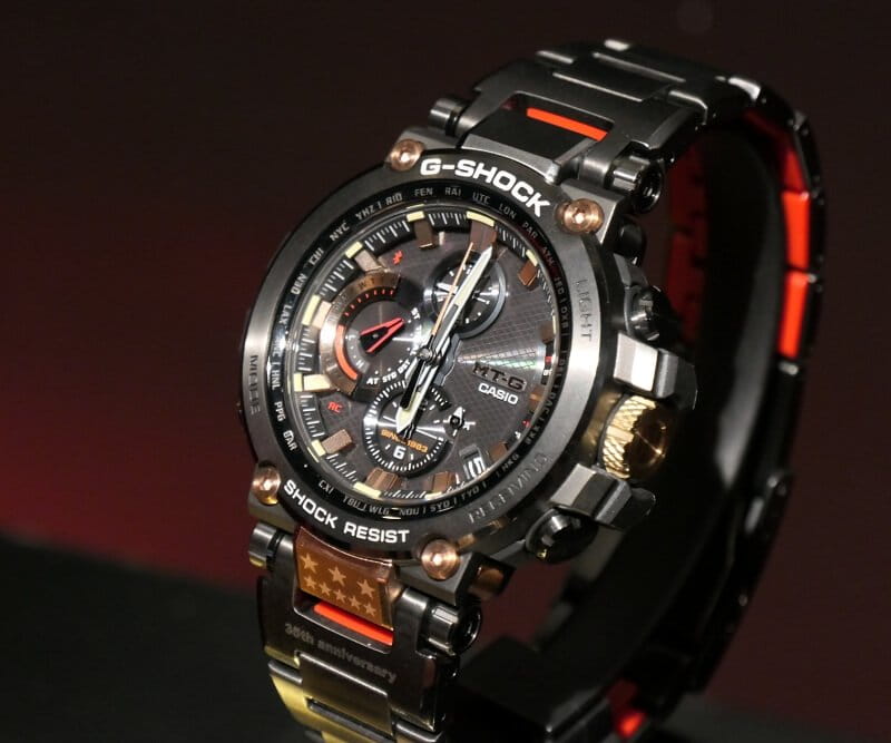 Производитель часов Casio представил новинку MTG-серии выпущенную в ограниченном количестве, и приурочил данное событие 35-летнему юбилею торговой марки G-SHOCK Цвет часов черный, с дизайнерскими акцентами на золотом и красном, которые могут быть вами истолкованы как отсылки к юбилейной тематике Ремешок снаружи выполнен в черном цвете, и красный изнутри Каркас новинки представляет собой доработанную ударостойкую конструкцию, из-за внешних ее особенностей наручные часы стали выглядеть более представительно. Модель получила юбилейную надпись на циферблате "Since 1983" и гравировку звезд, символизирующих 35 лет жизни бренда в нижней части циферблата.