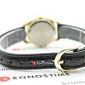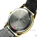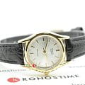 Яркий, золотой корпус часов привлекательно сочетается вместе с черным ремнем из кожи. Циферблат модели имеет круглую форму и выдержан в цвете шампань. На циферблате расположены аккуратные показатели времени и три стильные, золотые стрелки. Кварцевый механизм часов работает от батарейки. Циферблат надежно защищен от повреждений минеральным стеклом. Данная модель имеет показатель водонепроницаемости WR10. Прочный корпус аксессуара сделан из латуни.
