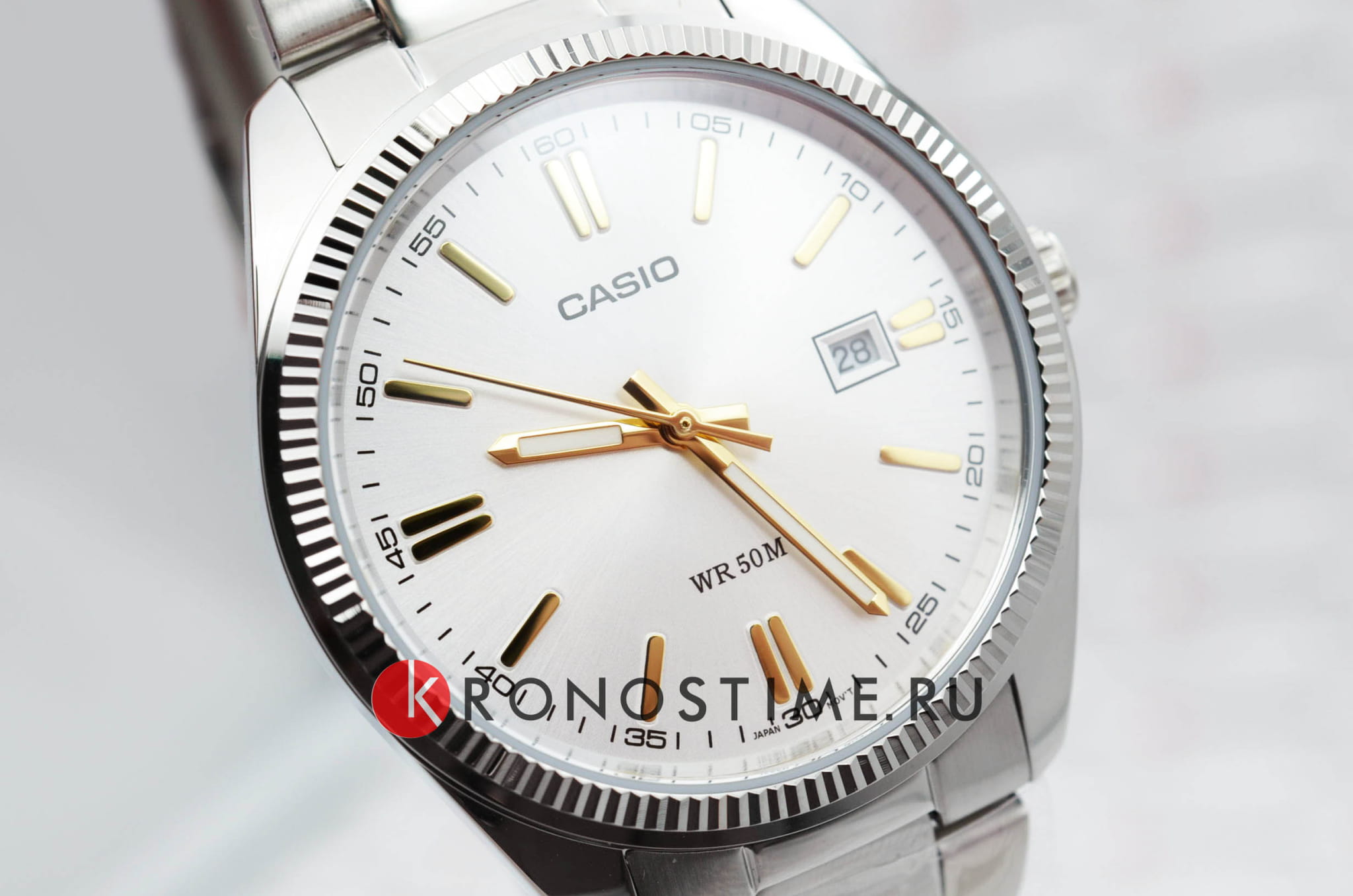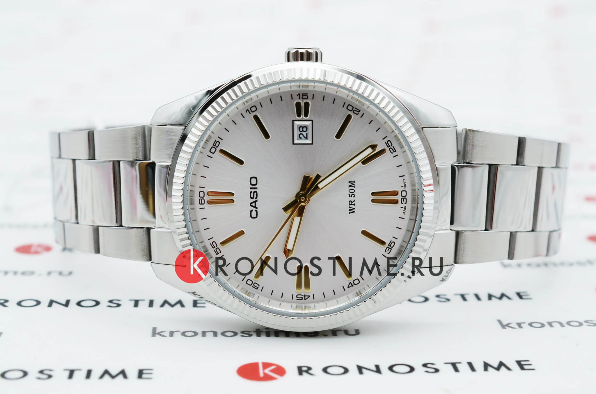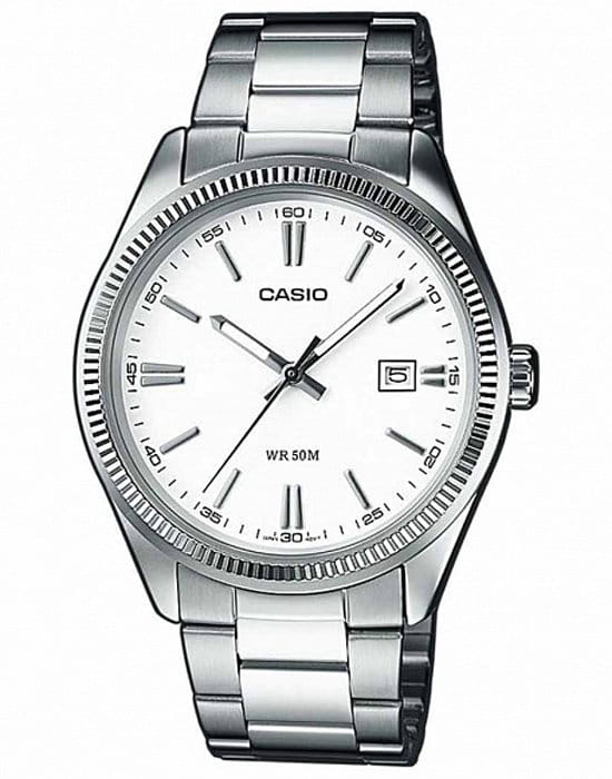 Японские мужские часы из коллекции MTP Collection воплощают собой классику в современном исполнении, минималистичное оформление позволяет носить часы в качестве дополнения к повседневному, деловому, повседневному образу. Лаконичный белый циферблат с серебристыми стрелками и метками никогда не утратит актуальности. Элегантности добавляет фактурный безельБезельВнешний ободок, закрепляющий стекло. В спортивных часах так называется поворотное кольцо с делениями на циферблате, выполняет роль таймера – замеряет отрезки времени на шкале. Неподвижный безель – элемент декора. Однонаправленно вращающийся безель на дайверских часах позволяет фиксировать моменты погружения и выныривания на поверхность.. Браслет сделан из нержавеющей стали 316L, отличающейся устойчивостью к царапинам и износу, для корпуса была выбрана гипоаллергенная латунь. Кварцевый механизм с высокой точностью хода. Водостойкость 50 метров. Стрелки с люминесцентным покрытиемЛюминесцентное покрытиеПозволяет считывать показания времени в темноте. Производители наносят на стрелки, часовые индексы, безель или поверхность циферблата светонакопительный состав, дающий холодное свечение.. Минеральное стекло. Апертура даты. Габариты: 44,2 x 38,5 x 9,2 мм.
