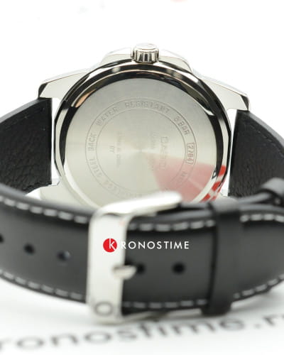Тёмный циферблат с серебристыми часовыми метками и стрелками позволяет использовать часы в сочетании с одеждой любого цвета. Корпус из гипоаллергенной латуни отличается лёгкостью, чёрный ремешок из натуральной кожи надёжно обхватывает запястье. Срок службы батарейки для питания кварцевого механизма - 3 года. Люминесцентная подсветкаЛюминесцентное покрытиеПозволяет считывать показания времени в темноте. Производители наносят на стрелки, часовые индексы, безель или поверхность циферблата светонакопительный состав, дающий холодное свечение.. Сохранение водонепроницаемости при давлении до 5 бар. Минеральное стекло. Габариты: 44,9 x 50 x 9,4 мм.