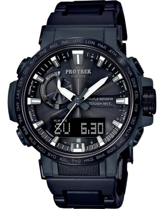 По сравнению с предыдущими моделями линейки Casio PRW-6000 аксессуар получился более тонким и компактным. Наручные часы выполнены в спортивном стиле, тёмный циферблат дополнен контрастными элементами. Ударопрочный корпусУдаропрочный корпусМеханизм заключён в корпус, выполненный из современных материалов, устойчивых к ударам, механическим повреждениям и падению с высоты: инновационный пластик, карбон, нержавеющая сталь, титан. выполнен из полимера, такой материал отлично поглощает силу удара и вибрации, безель стальной. Стильно выглядит полимерный ремешок с металлическими вставками, обеспечивающий комфорт при ношении. Питание от солнечной энергии , есть индикатор уровня заряда батарейки. Минеральное стекло. Водозащита 10 бар. Функционал: барометр, высотомер с памятью данных, таймер, термометр, будильник, мировое времяМировое время Полезное часовое усложнение, отображающее время в основных городах и известных областях по всему миру, оно связано с часовыми поясами, удобно для путешественников и бизнесменов. , компас. Светодиодная подсветкаСветодиодная подсветкаСветодиодная или LED-подсветка обеспечивает появление яркого холодного свечения за счёт LED-элементов - маленьких лампочек. Они потребляют минимальное количество энергии, чаще всего можно встретить 1 светодиод, в нижней части циферблата. экрана, стрелки с ярким люминесцентным покрытиемЛюминесцентное покрытиеПозволяет считывать показания времени в темноте. Производители наносят на стрелки, часовые индексы, безель или поверхность циферблата светонакопительный состав, дающий холодное свечение.. Габариты: 50,5 x 47,2 x 13,3 мм.