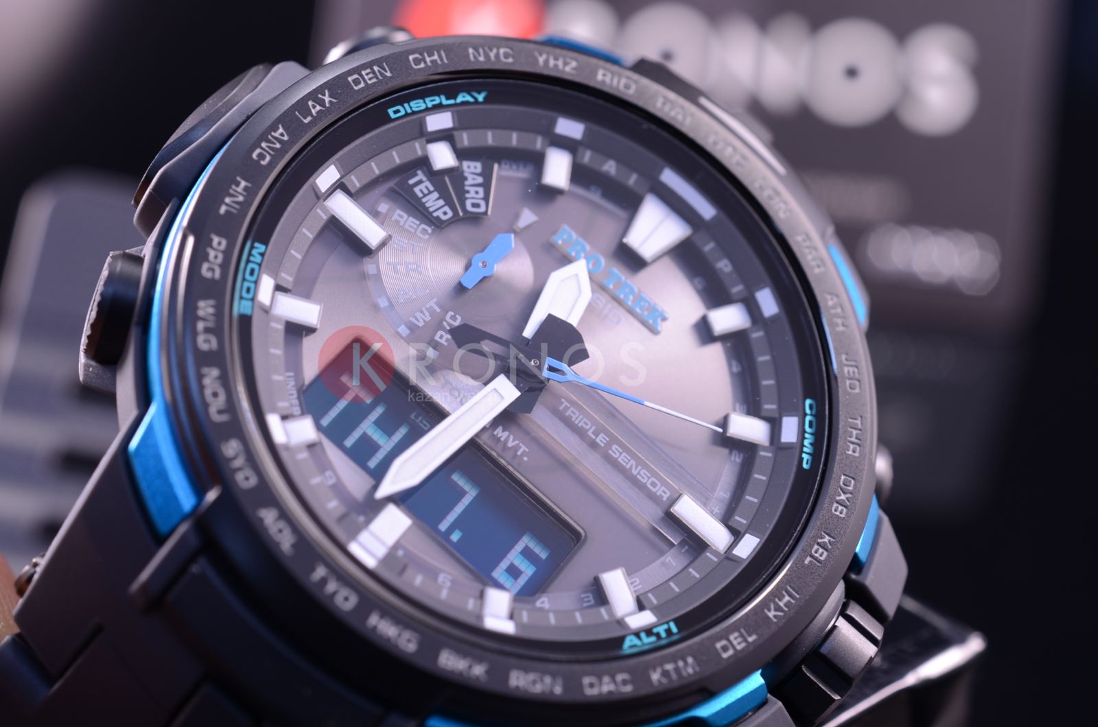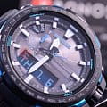 Флагманский аксессуар с аналого-цифровым дисплеем дополнен яркими голубыми деталями. Ни одна туристическая вылазка не обойдётся без этих часов, ведь они оснащены барометром, термометром -10°C /+60°C, альтиметром, цифровым компасом, хронографомХронографФункция позволяет измерять отрезки времени с особой точностью: часы, минуты, секунды. Верным признаком хронографа является наличие на циферблате 3 дополнительных окошек-счётчиков., таймером, функцией мирового времениМировое время Полезное часовое усложнение, отображающее время в основных городах и известных областях по всему миру, оно связано с часовыми поясами, удобно для путешественников и бизнесменов. – 29 часовых поясов и UTCUTCВсемирное кординационное время, не имеющее привязки к географическому положению Гринвича, основывается на атомном отсчёте времени. Регулировка времени осуществляется более точно, чем устаревшее GMT.
