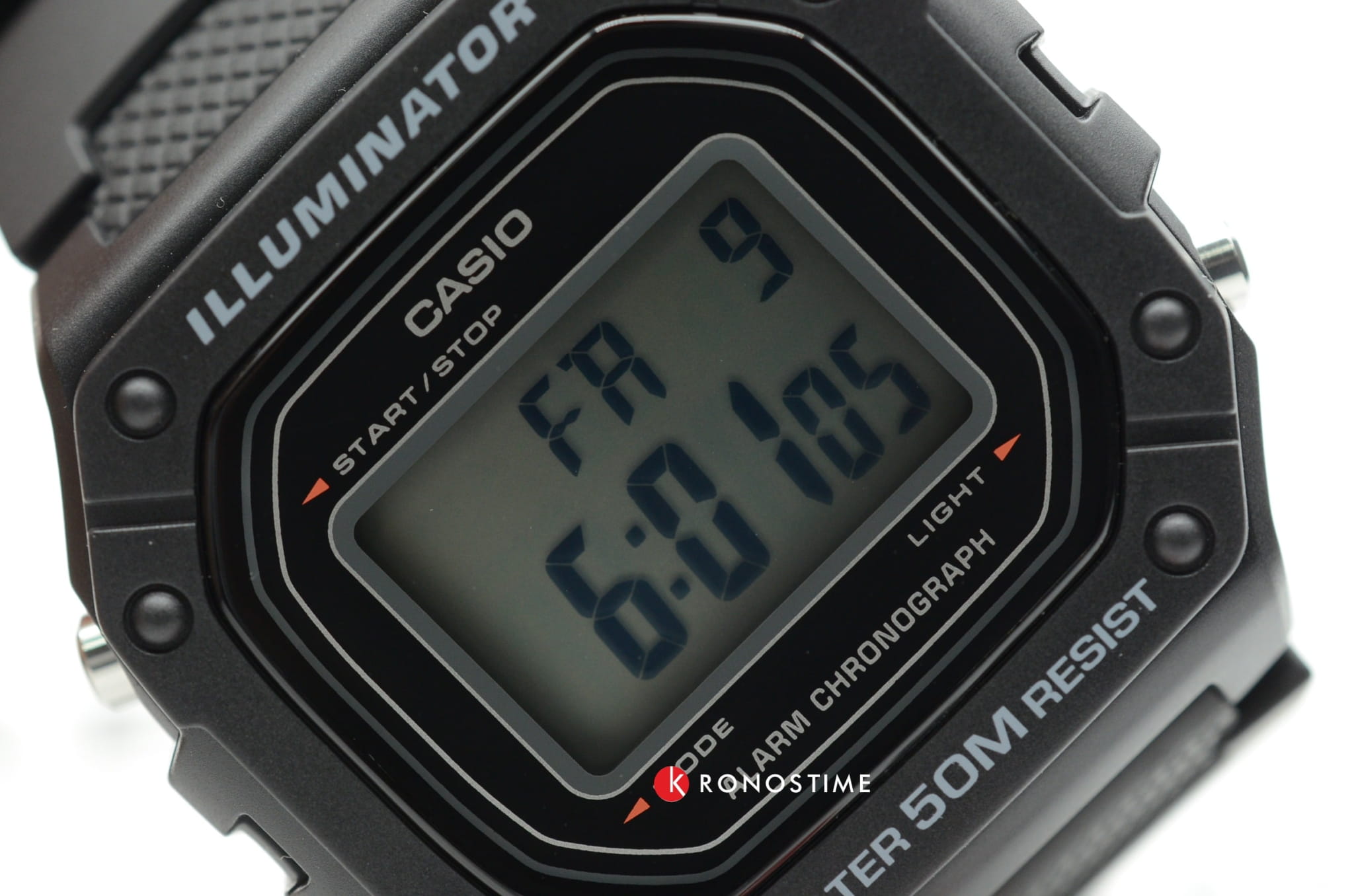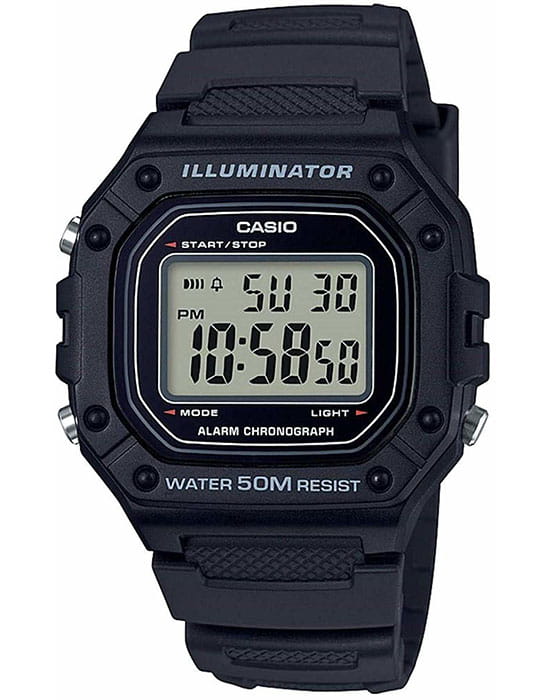 Спортивные японские мужские часы-хронографХронографФункция позволяет измерять отрезки времени с особой точностью: часы, минуты, секунды. Верным признаком хронографа является наличие на циферблате 3 дополнительных окошек-счётчиков. Casio Collection W-218H-1A, кварцевый механизм с высокой точностью, органическое стекло. Корпус часов изготовлен из пластика. Светодиодная подсветкаСветодиодная подсветкаСветодиодная или LED-подсветка обеспечивает появление яркого холодного свечения за счёт LED-элементов - маленьких лампочек. Они потребляют минимальное количество энергии, чаще всего можно встретить 1 светодиод, в нижней части циферблата. освещает весь циферблат. Цвет подсветки: оранжевый. 12-ти и 24-х часовой формат времени. СекундомерСекундомерСекундоме́р — прибор, способный измерять интервалы времени с точностью до долей секунды. с точностью показаний 1/100с и временем измерения 1ч. Сплит-хронографСплит-хронографИспользуется для измерения продолжительности нескольких временных отрезков, начинающихся одновременно, а заканчивающихся в разное время.. БудильникБудильникБуди́льник — часы, в заданный момент времени подающие звуковой, световой и/или в редких случаях другой сигнал., ежечасный сигнал. Класс водозащиты: 50 метров, позволит защитить корпус от случайных брызг или капель дождя. Ремешок из полимерного материала на стандартной застежке.