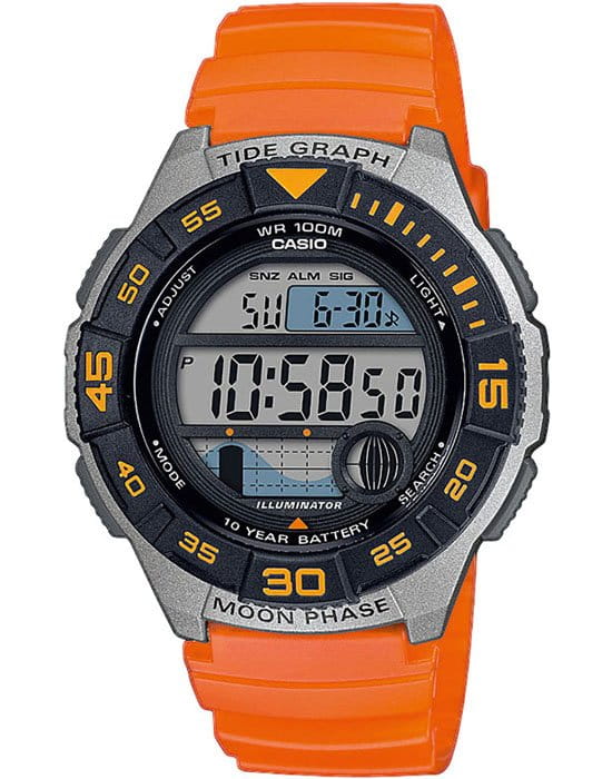 Электролюминесцентная подсветка освещает весь циферблат, после отпускания кнопки свечение продолжается еще некоторое время. Мировое время с дополнительным циферблатом, который позволяет настроить выбор места и времени второго часового пояса и при необходимости вывести на экран. Второй часовой пояс. 12-ти и 24-х часовой формат времени. Отображение возраста и фазы Луны. Графически отображаются сведения о приливах и отливах, основанные на широте и долготе. Секундомер с точностью показаний 1/100с и временем измерения 24ч. Сплит-хронограф. Таймер обратного отсчета от 1мин до 24ч с автоповтором. Безель вращается в одном направлении. Типы сигналов: ежедневный, ежемесячный, каждый день определенного месяца, на определенную дату. Функция включения/отключения звука.