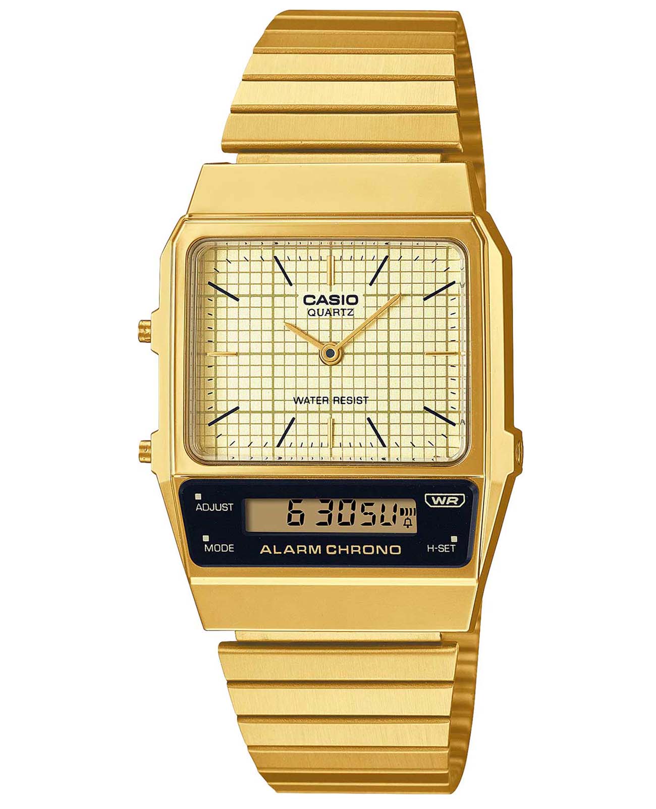 Спортивные японские унисекс часы с секундомеромСекундомерСекундоме́р — прибор, способный измерять интервалы времени с точностью до долей секунды. Casio Vintage AQ-800EG-9A, кварцевый механизм с высокой точностью. Класс водозащиты: 30 метров, позволит защитить корпус от случайных брызг или капель дождя. Корпус часов изготовлен из пластика серебристого цвета. На черном циферблате центральные часовая и минутная стрелки. Отдельно вынесен дополнительный циферблат мирового времениМировое время Полезное часовое усложнение, отображающее время в основных городах и известных областях по всему миру, оно связано с часовыми поясами, удобно для путешественников и бизнесменов. , позволяющий одновременно отобразить время двух часовых поясов . У модели присутствуют функции секундомераСекундомерСекундоме́р — прибор, способный измерять интервалы времени с точностью до долей секунды. с точностью 1/100 секунды и пределом измерения 1 час, ежедневного будильникаБудильникБуди́льник — часы, в заданный момент времени подающие звуковой, световой и/или в редких случаях другой сигнал.. Стальной браслет с IP-покрытиемIP-покрытиеМетод ионного напыления. Демонстрирует повышенную устойчивость к истиранию, окислению и химическим веществам. Под воздействием высокого давления и температуры около 1500°C молекулы металла надёжно соединяются с частицами корпуса часов. с регулируемой застежкой.