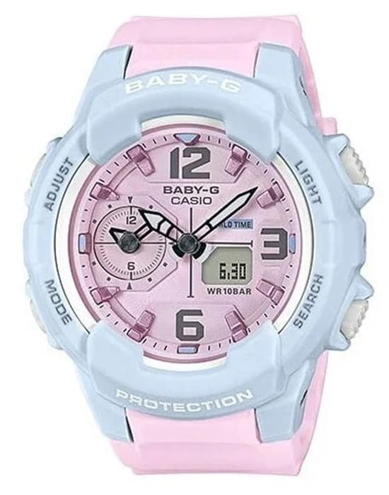 Женские противоударные японские наручные часы Casio Baby-G BGA-230PC-2B, кварцевый механизм с высокой точностью. Класс водозащиты: 100 метров, позволит плавать, нырять и заниматься другими водными видами спорта. Корпус часов изготовлен из пластика, цвета.