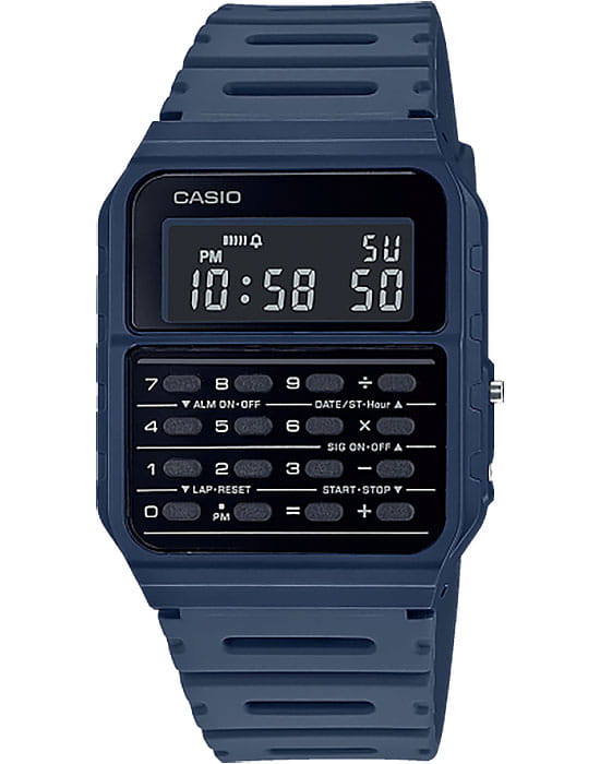 Аксессуар привлекает синим олдскульным исполнением, напоминающим о начальном успехе компании Casio. Модель серии Vintage оснащены калькулятором для различных математических операций с использованием чисел, содержащих до 8 знаков. Среди дополнительных функций: секундомер с точностью 1/100 секунды, индикация второго часового пояса, хронографХронографФункция позволяет измерять отрезки времени с особой точностью: часы, минуты, секунды. Верным признаком хронографа является наличие на циферблате 3 дополнительных окошек-счётчиков., будильник, ежечасный сигнал, вечный календарьВечный календарьКлассическое часовое усложнение, представляющее собой календарь, рассчитанный на несколько лет вперёд (стандартно – до 2099 года). Определяет текущую дату, день недели, месяц. до 2099 года. Корпус и браслет изготовлены из полимерного материала, современный пластик комфортно ощущается на запястье и устойчив к ударам. Часы работают за счёт японского кварцевого механизма, 1 батарейка рассчитана на 5 лет службы. Для защиты циферблата используется акриловое стекло. Габариты: 43,2 x 34,4 x 8,2 мм.