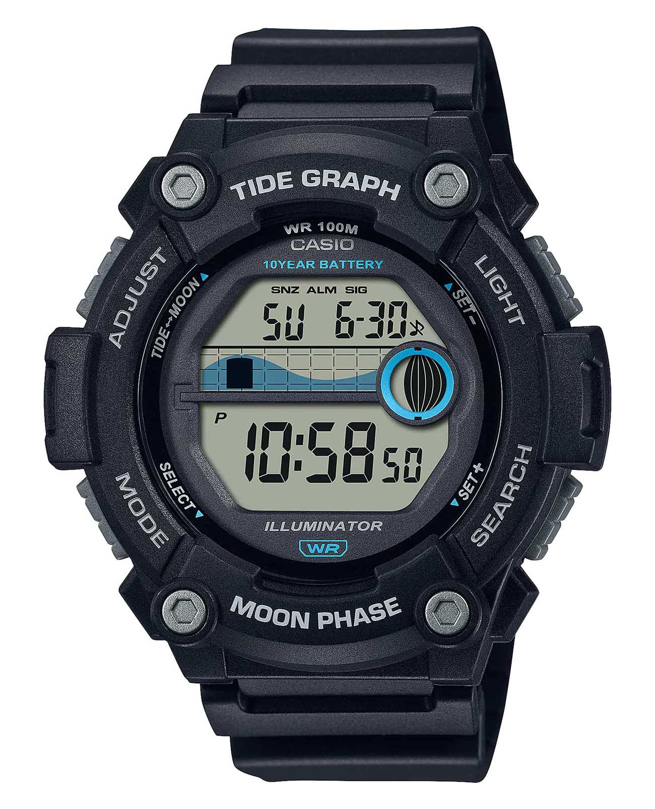 Спортивные японские мужские часы-хронографХронографФункция позволяет измерять отрезки времени с особой точностью: часы, минуты, секунды. Верным признаком хронографа является наличие на циферблате 3 дополнительных окошек-счётчиков. Casio Collection WS-1300H-1A, кварцевый механизм с высокой точностью, органическое стекло. Корпус часов изготовлен из плачтика. Светодиодная подсветкаСветодиодная подсветкаСветодиодная или LED-подсветка обеспечивает появление яркого холодного свечения за счёт LED-элементов - маленьких лампочек. Они потребляют минимальное количество энергии, чаще всего можно встретить 1 светодиод, в нижней части циферблата. освещает весь циферблат. Цвет подсветки: оранжевый. Отображение возраста Луны на конкретную дату и графика фаз Луны. 12-ти и 24-х часовой формат времени. СекундомерСекундомерСекундоме́р — прибор, способный измерять интервалы времени с точностью до долей секунды. с точностью показаний 1/100с и временем измерения 1ч. Сплит-хронографСплит-хронографИспользуется для измерения продолжительности нескольких временных отрезков, начинающихся одновременно, а заканчивающихся в разное время.. Батарейка рассчитана на 10 лет. ТаймерТаймерОтсчитывает секунды в обратном направлении в заданном интервале времени. обратного отсчета от 1мин до 24ч с автоповтором. График приливов и отливов. Функция включения/отключения звука. Типы сигналов: ежедневный, ежемесячный, каждый день определенного месяца, на определенную дату. Класс водозащиты: 100 метров, позволит плавать, нырять и заниматься другими водными видами спорта. Ремешок из полимерного материала на стандартной застежке.