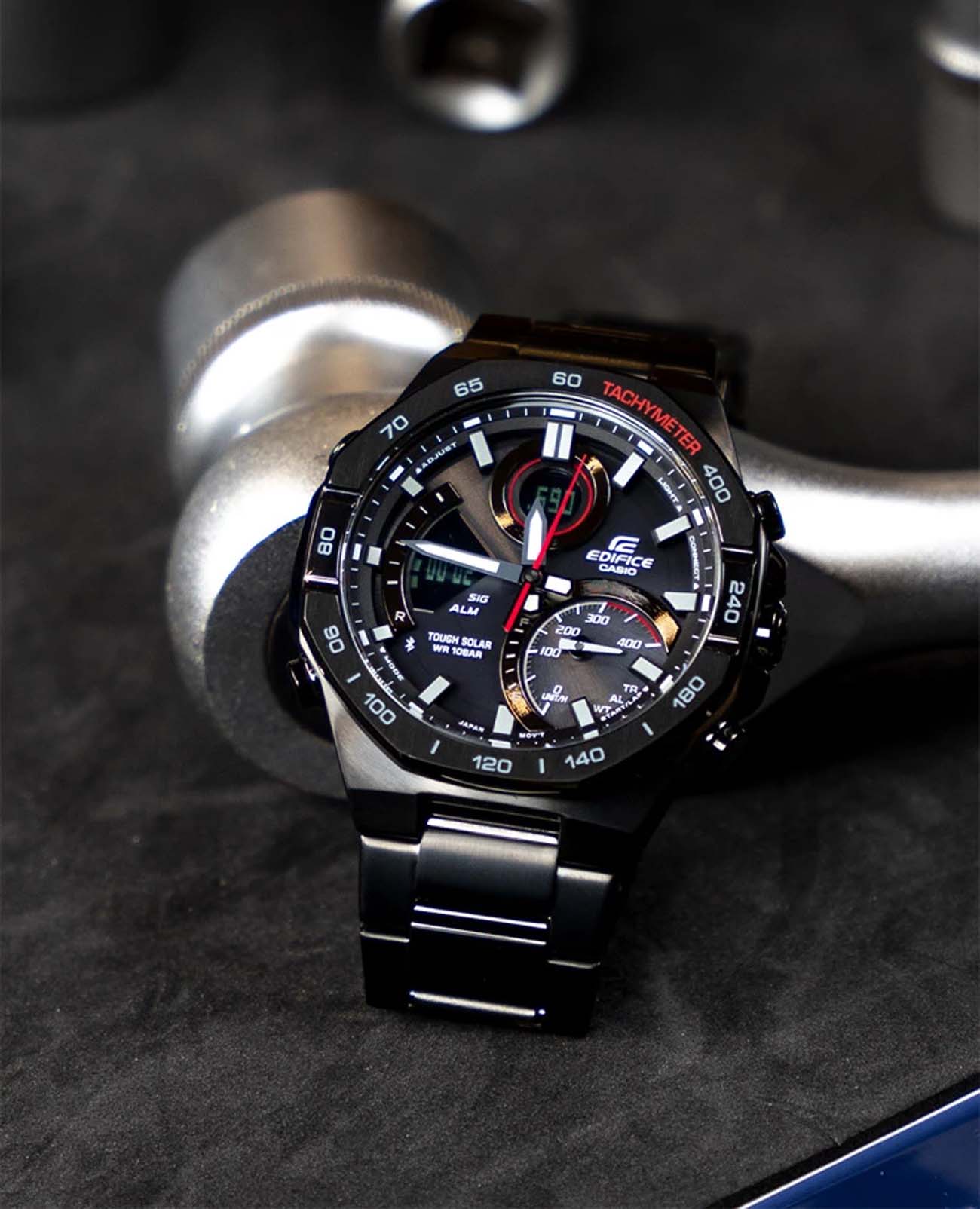 Японские мужские часы-хронографХронографФункция позволяет измерять отрезки времени с особой точностью: часы, минуты, секунды. Верным признаком хронографа является наличие на циферблате 3 дополнительных окошек-счётчиков. Casio Edifice ECB-950DC-1A . Tough SolarTough SolarТехнология основана на подзарядке аккумулятора от источника солнечного света, специальная панель улавливает солнечные лучи и преобразует их в энергию для работы часов. Достаточно пары минут нахождения на солнце для функционирования часов в течении суток., индикатор низкого заряда батареи. Функция автоматического сохранения энергии. Время работы аккумулятора без подзарядки приблизительно 6 месяцев, при включенной функции сохранения энергии приблизительно 19 месяцев. Двойная подсветка Super Illuminator с функцией Afterglow, одновременно подсвечивается аналоговый циферблат и цифровой дисплей. Люминесцентное покрытиеЛюминесцентное покрытиеПозволяет считывать показания времени в темноте. Производители наносят на стрелки, часовые индексы, безель или поверхность циферблата светонакопительный состав, дающий холодное свечение. Neobrite обеспечивает длительное послесвечение в темноте даже после кратковременного нахождения на свету. Таймер обратного отсчета от 1 сек до 24 ч. Мировое время – 39 городов (39 часовых поясов). Автоматический переход на зимнее и летнее время. Беспроводная технология BluetoothBluetoothСовременная технология, позволяющая синхронизировать часы с телефоном и переносить данные. Часы с Bluetooth расширяют возможности вашего смартфона и делают его использование ещё более удобным.. Приложение EDIFICE Connected позволяет вести журнал показаний секундомера и прохождения этапов, вычислять разность между заданным временем и временем этапа. Память на 200 этапов. Измерение скорости отображается на ретроградном циферблате в положении 4 часа. Функция перемещения стрелок для беспрепятственного просмотра информации на цифровых дисплеях, включения/отключения звука и поиска телефона. Заводная головка с защитой. Браслет с тройной раскладывающейся застежкой, расстегиваемой одним касанием. Стальной корпус, защищенный минеральным стекломМинеральное стеклоМинеральное стекло представляет собой искусственно выращенный минерал кварца. Такое стекло отличается особой устойчивостью к повреждениям и царапинам. Уступает по некоторым качествам сапфировому стеклу.. Стальной браслет на раскладной застёжкеРаскладная застёжкаТакой тип застёжки используется только на браслетах из металла. Она никогда не раскрывается полностью, происходит разделение на 2 и более частей. Раскладывающая застёжка снизит вероятность потери часов к минимуму.. СекундомерСекундомерСекундоме́р — прибор, способный измерять интервалы времени с точностью до долей секунды.. Класс водозащиты: 100 метров, позволит плавать, нырять и заниматься другими водными видами спорта.