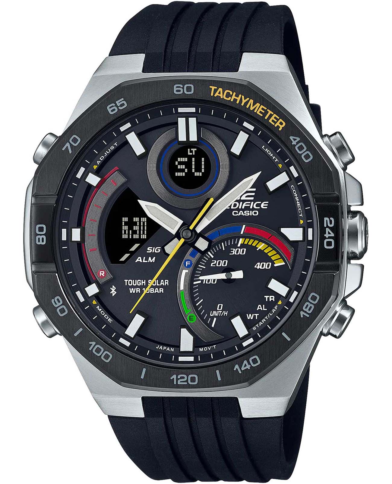 Японские мужские часы-хронографХронографФункция позволяет измерять отрезки времени с особой точностью: часы, минуты, секунды. Верным признаком хронографа является наличие на циферблате 3 дополнительных окошек-счётчиков. Casio Edifice ECB-950MP-1ADF. Tough SolarTough SolarТехнология основана на подзарядке аккумулятора от источника солнечного света, специальная панель улавливает солнечные лучи и преобразует их в энергию для работы часов. Достаточно пары минут нахождения на солнце для функционирования часов в течении суток., индикатор низкого заряда батареи. Функция автоматического сохранения энергии. Время работы аккумулятора без подзарядки приблизительно 6 месяцев, при включенной функции сохранения энергии приблизительно 19 месяцев. Двойная подсветка Super Illuminator с функцией Afterglow, одновременно подсвечивается аналоговый циферблат и цифровой дисплей. Люминесцентное покрытиеЛюминесцентное покрытиеПозволяет считывать показания времени в темноте. Производители наносят на стрелки, часовые индексы, безель или поверхность циферблата светонакопительный состав, дающий холодное свечение. Neobrite обеспечивает длительное послесвечение в темноте даже после кратковременного нахождения на свету. Таймер обратного отсчета от 1 сек до 24 ч. Мировое время – 39 городов (39 часовых поясов). Автоматический переход на зимнее и летнее время. Беспроводная технология BluetoothBluetoothСовременная технология, позволяющая синхронизировать часы с телефоном и переносить данные. Часы с Bluetooth расширяют возможности вашего смартфона и делают его использование ещё более удобным.. Приложение EDIFICE Connected позволяет вести журнал показаний секундомера и прохождения этапов, вычислять разность между заданным временем и временем этапа. Память на 200 этапов. Измерение скорости отображается на ретроградном циферблате в положении 4 часа. Функция перемещения стрелок для беспрепятственного просмотра информации на цифровых дисплеях, включения/отключения звука и поиска телефона. Заводная головка с защитой. Стальной корпус, защищенный минеральным стекломМинеральное стеклоМинеральное стекло представляет собой искусственно выращенный минерал кварца. Такое стекло отличается особой устойчивостью к повреждениям и царапинам. Уступает по некоторым качествам сапфировому стеклу.. Пластиковый браслет на стандартной застёжке. СекундомерСекундомерСекундоме́р — прибор, способный измерять интервалы времени с точностью до долей секунды.. Класс водозащиты: 100 метров, позволит плавать, нырять и заниматься другими водными видами спорта.