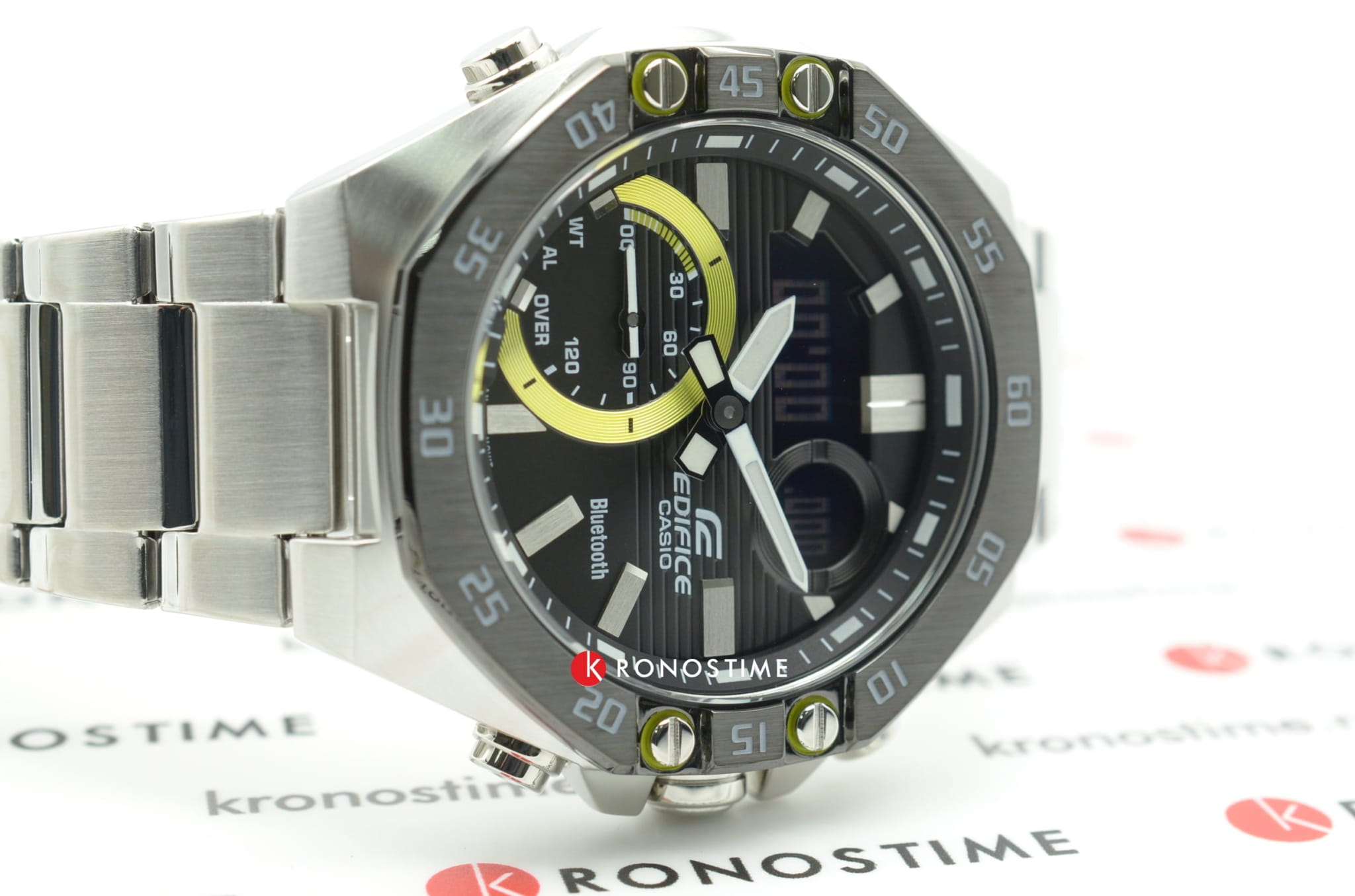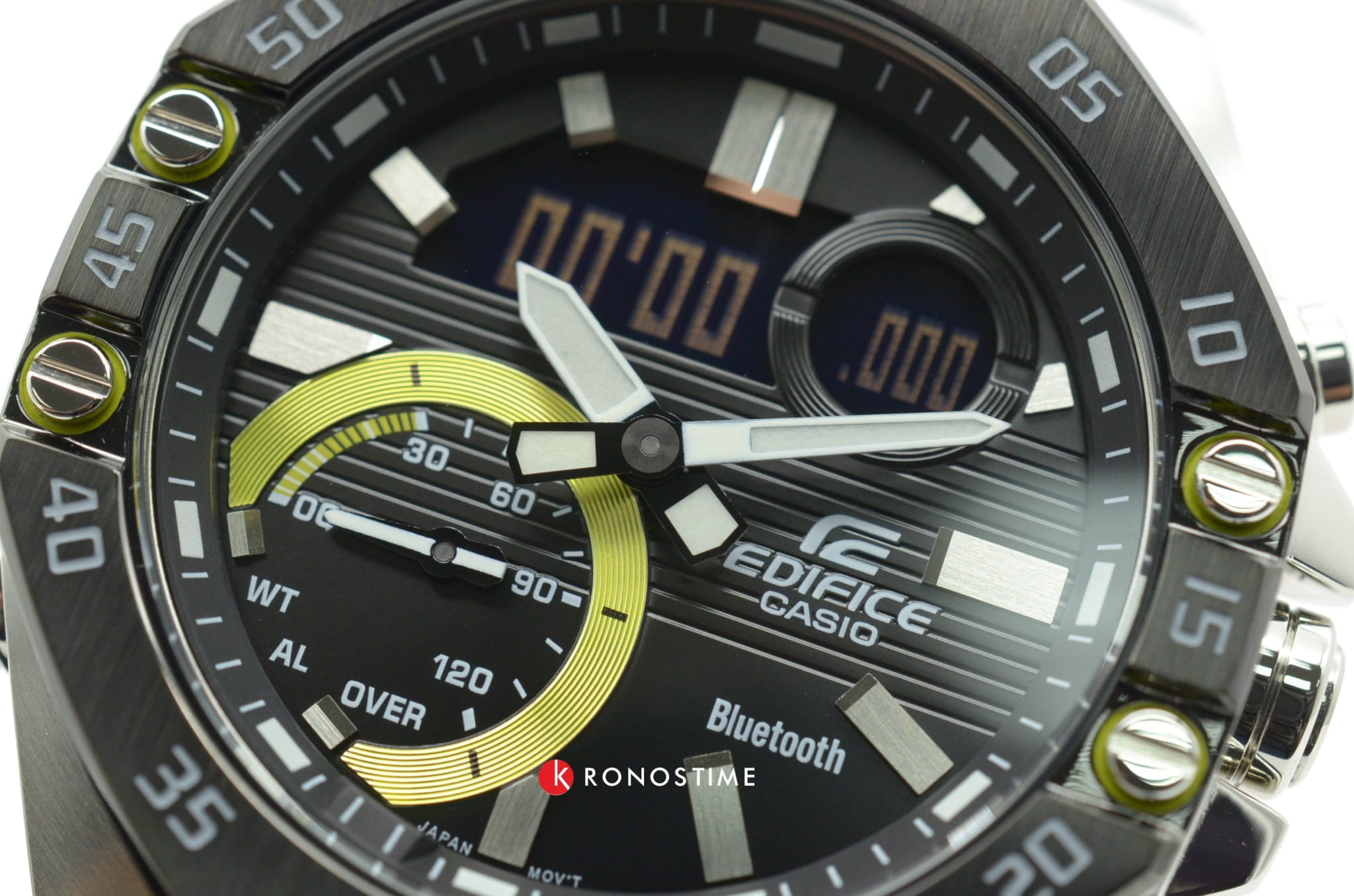 Casio Edifice ECB-10DB-1A – мужские часы, сочетающие спортивный дизайн и современные технологии. Корпус размером 51×48,5 мм и толщиной 12,5 мм выполнен из нержавеющей стали, обеспечивая прочность и устойчивость к коррозии. Чёрный циферблат с аналогово-цифровым отображением времени защищён минеральным стекломМинеральное стеклоМинеральное стекло представляет собой искусственно выращенный минерал кварца. Такое стекло отличается особой устойчивостью к повреждениям и царапинам. Уступает по некоторым качествам сапфировому стеклу., устойчивым к царапинам.