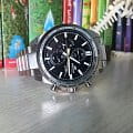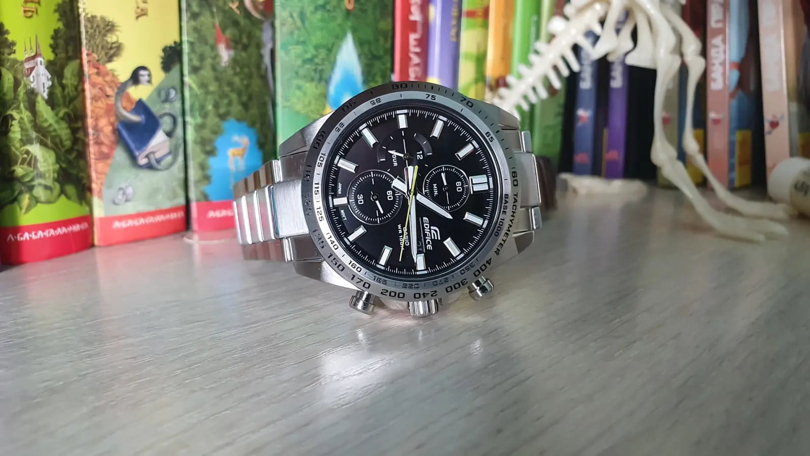 Мужские японские часы-хронограф Casio Edifice EFR-574D-1AEF. Корпус и браслет выполнены из нержавеющей стали. Минеральное стеклоМинеральное стеклоМинеральное стекло представляет собой искусственно выращенный минерал кварца. Такое стекло отличается особой устойчивостью к повреждениям и царапинам. Уступает по некоторым качествам сапфировому стеклу. устойчивое к мелким механическим повреждениям. Окошко даты и дня недели находится в положении 3 часа. Часы оснащены тахиметромТахиметрРазмеченная шкала, располагается на ободке или безеле часов. Тахиметр позволяет рассчитать скорость на определённом участке пути, расстояние измеряется в километрах или милях. и с секундомеромСекундомерСекундоме́р — прибор, способный измерять интервалы времени с точностью до долей секунды.. Стрелки и метки с люминесцентным покрытиемЛюминесцентное покрытиеПозволяет считывать показания времени в темноте. Производители наносят на стрелки, часовые индексы, безель или поверхность циферблата светонакопительный состав, дающий холодное свечение..